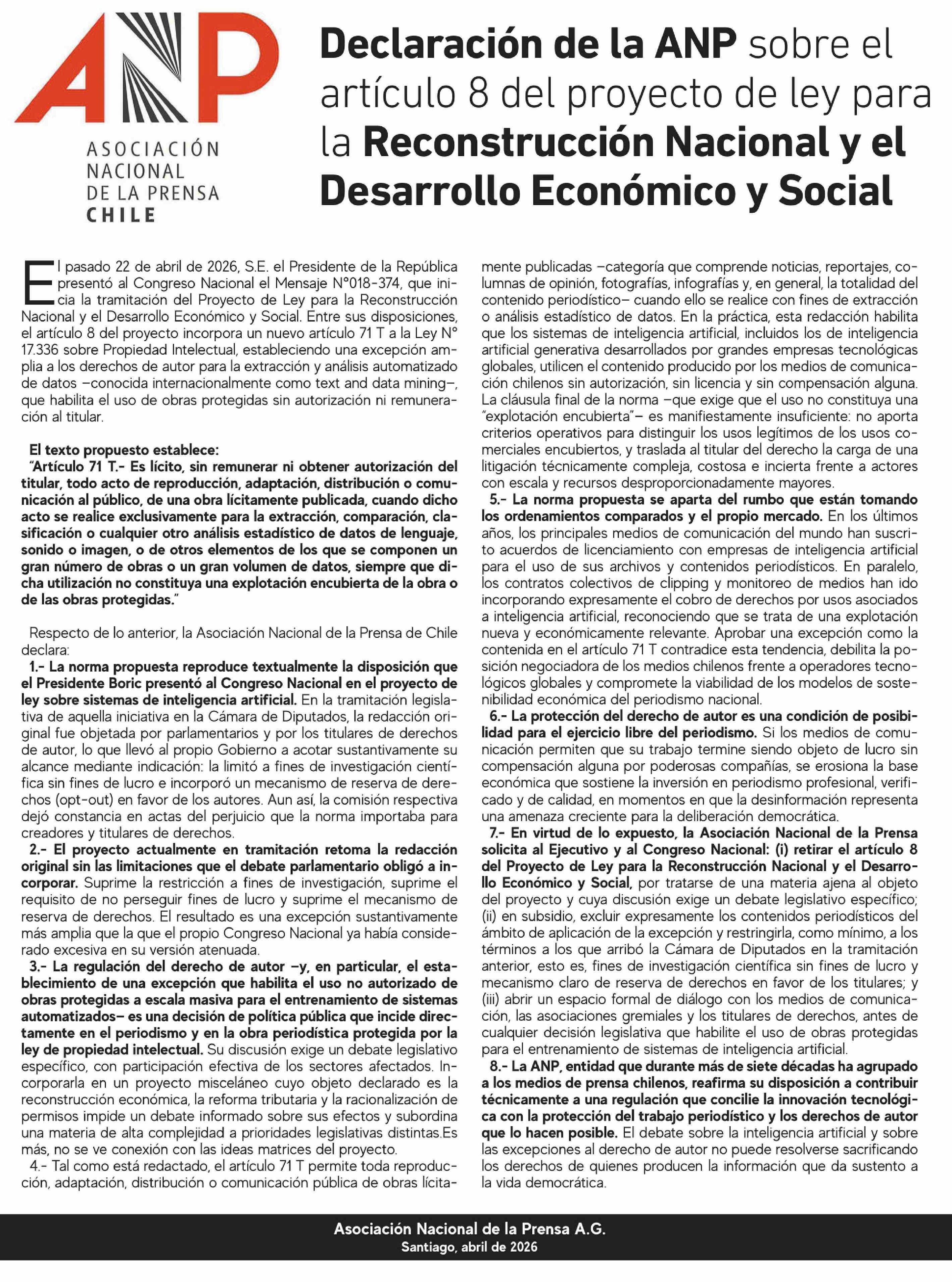Declaración de la ANP sobre el artículo 8 del proyecto de ley para la Reconstrucción Nacional y el Desarrollo Económico y Social