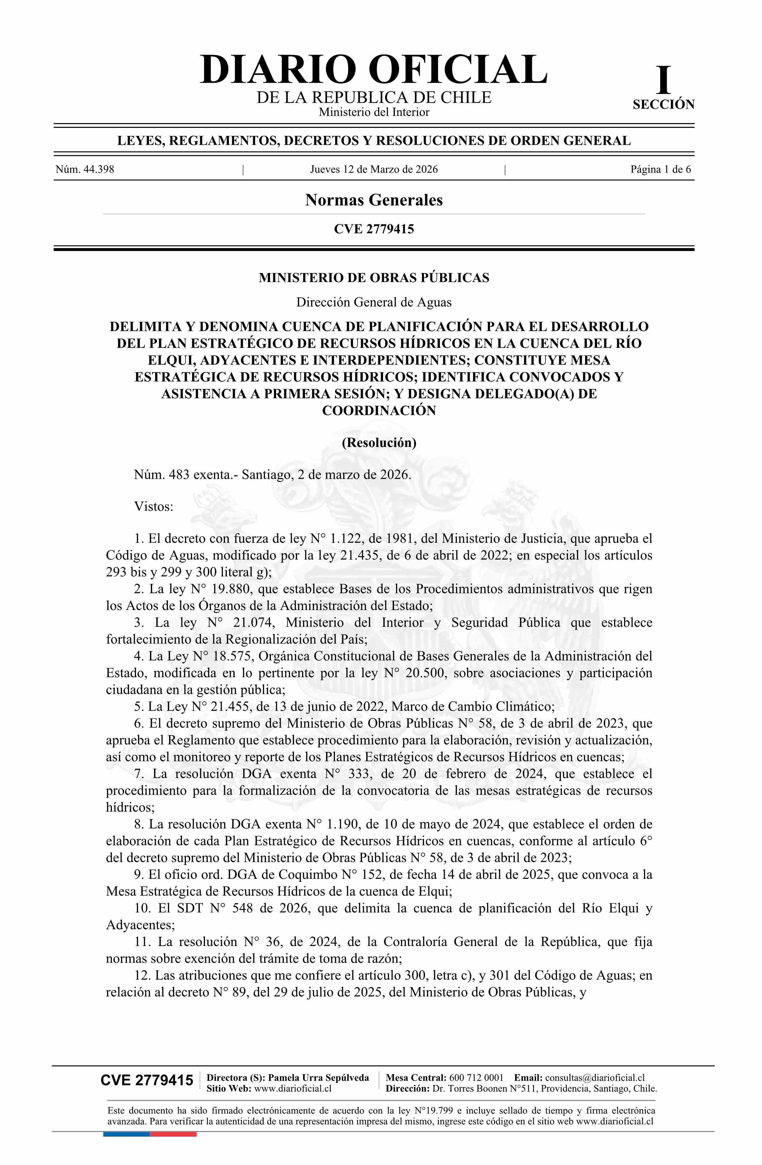 | Título: | Resolución exenta número 483, de 2026.- Delimita y denomina cuenca de planificación para el desarrollo del Plan Estratégico de Recursos Hídricos en la cuenca del Río Elqui, adyacentes e interdependientes; constituye Mesa Estratégica de Recursos Hídricos; identifica convocados y asistencia a primera |