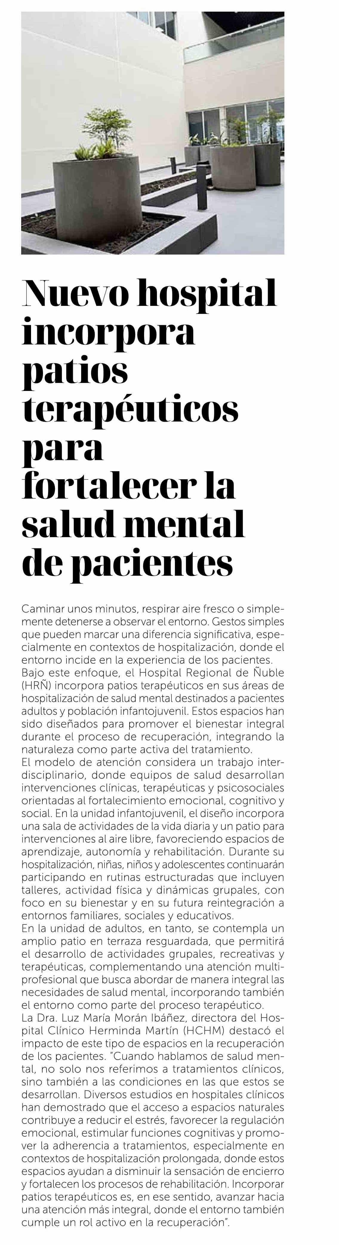 Nuevo hospital incorpora patios terapéuticos para fortalecer la salud mental de pacientes