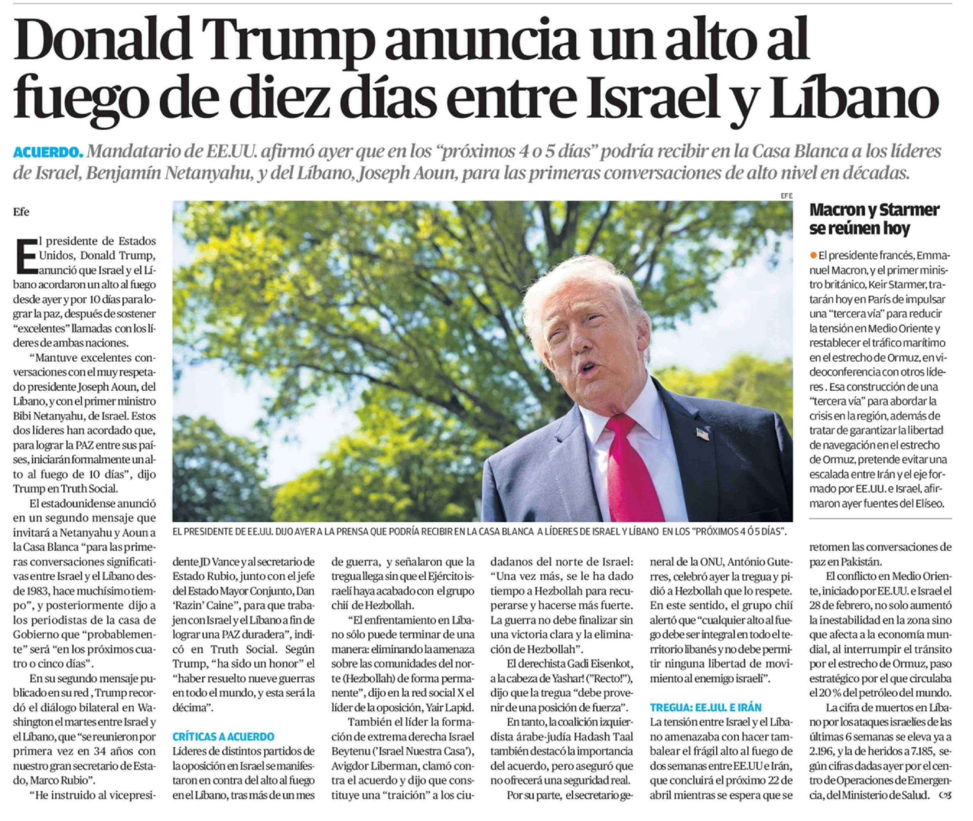 Donald Trump anuncia un alto al fuego de diez días entre Israel y Líbano