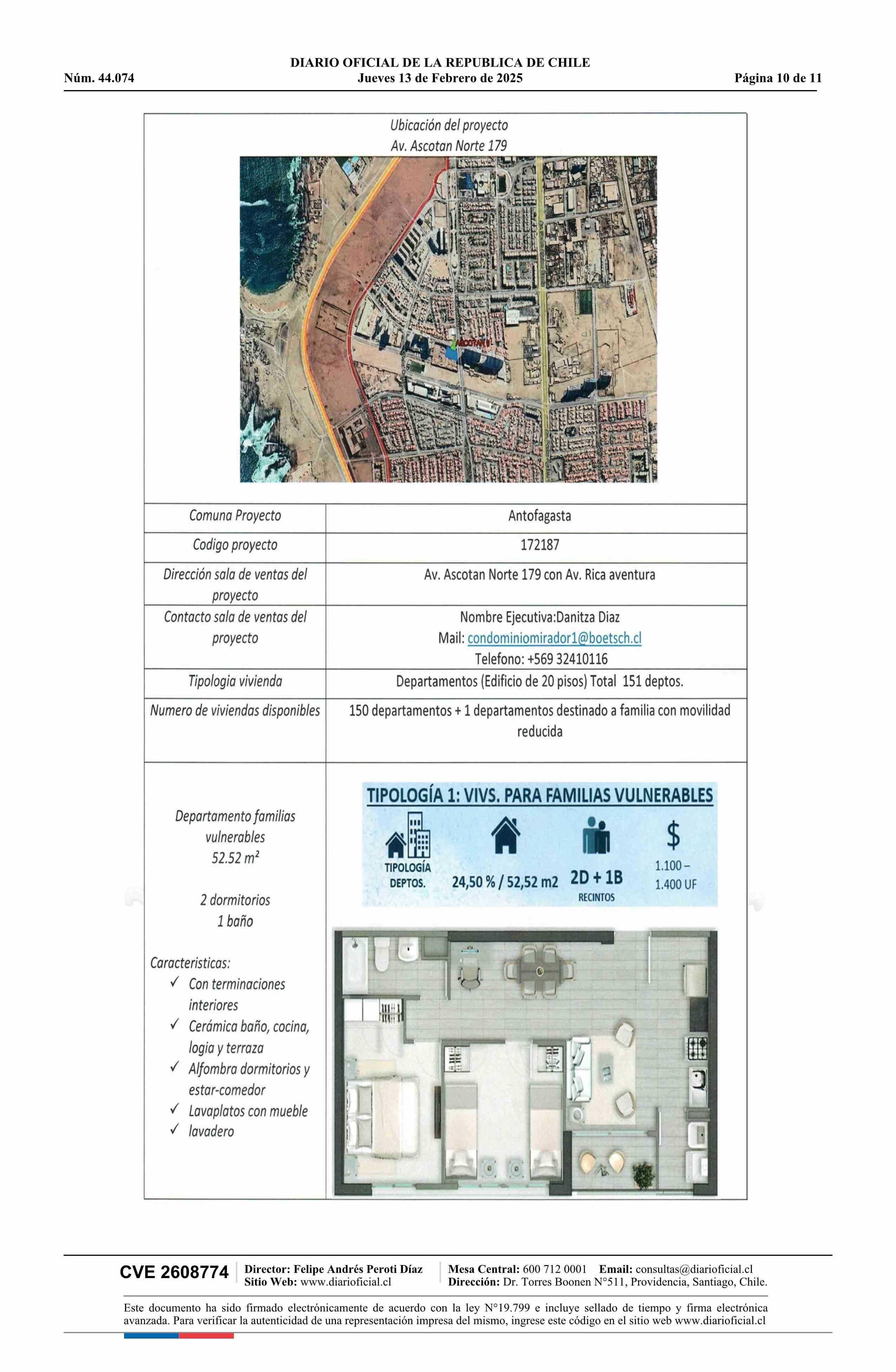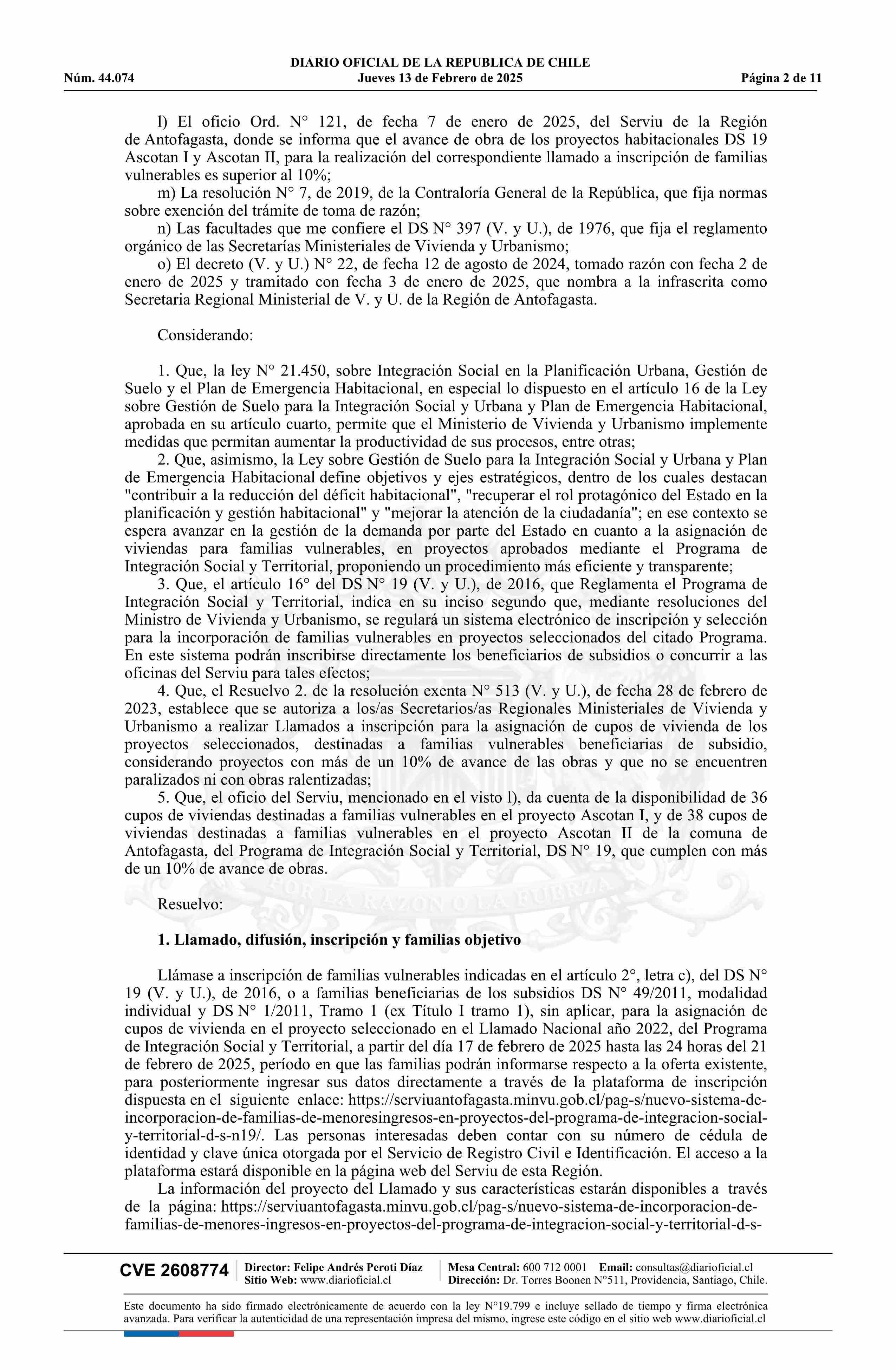 | Título: | Resolución exenta número 46, de 2025.- Llama a inscripción para asignación de cupos de vivienda destinados a familias vulnerables beneficiarias de subsidio en los proyectos seleccionados Condominio Ascotan I y II, de la comuna de Antofagasta, del Programa de Integración Social y Territorial decreto |