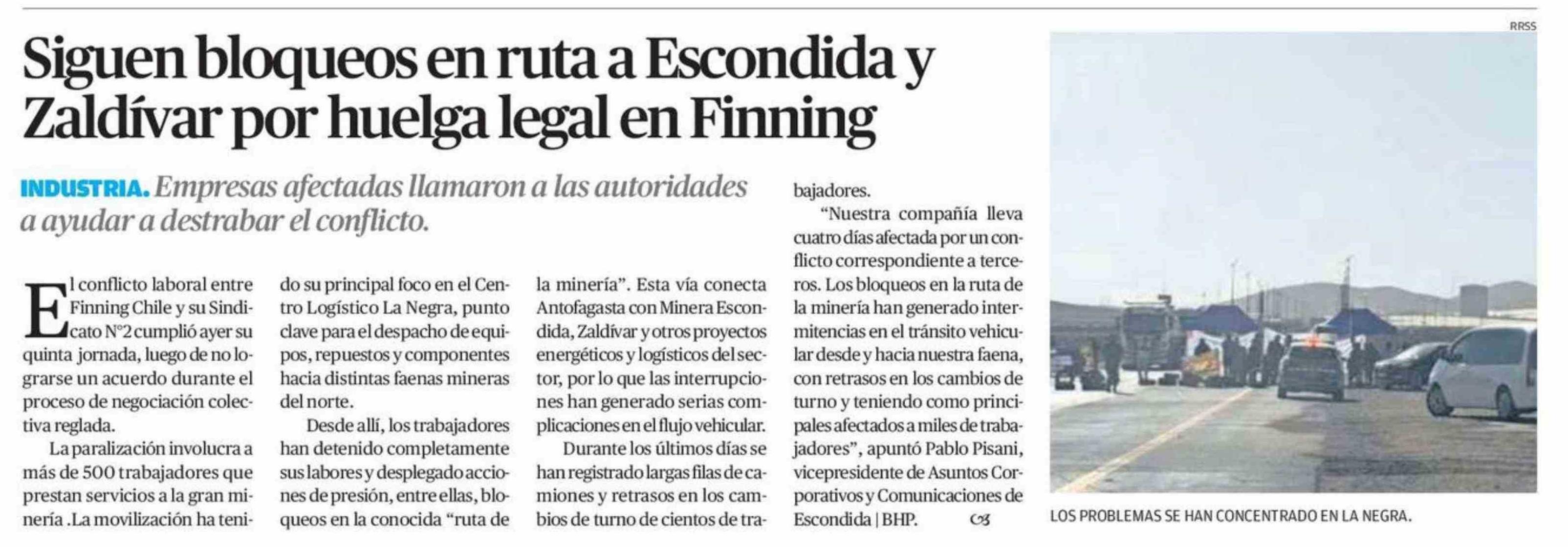 Siguen bloqueos en ruta a Escondida y Zaldívar por huelga legal en Finning