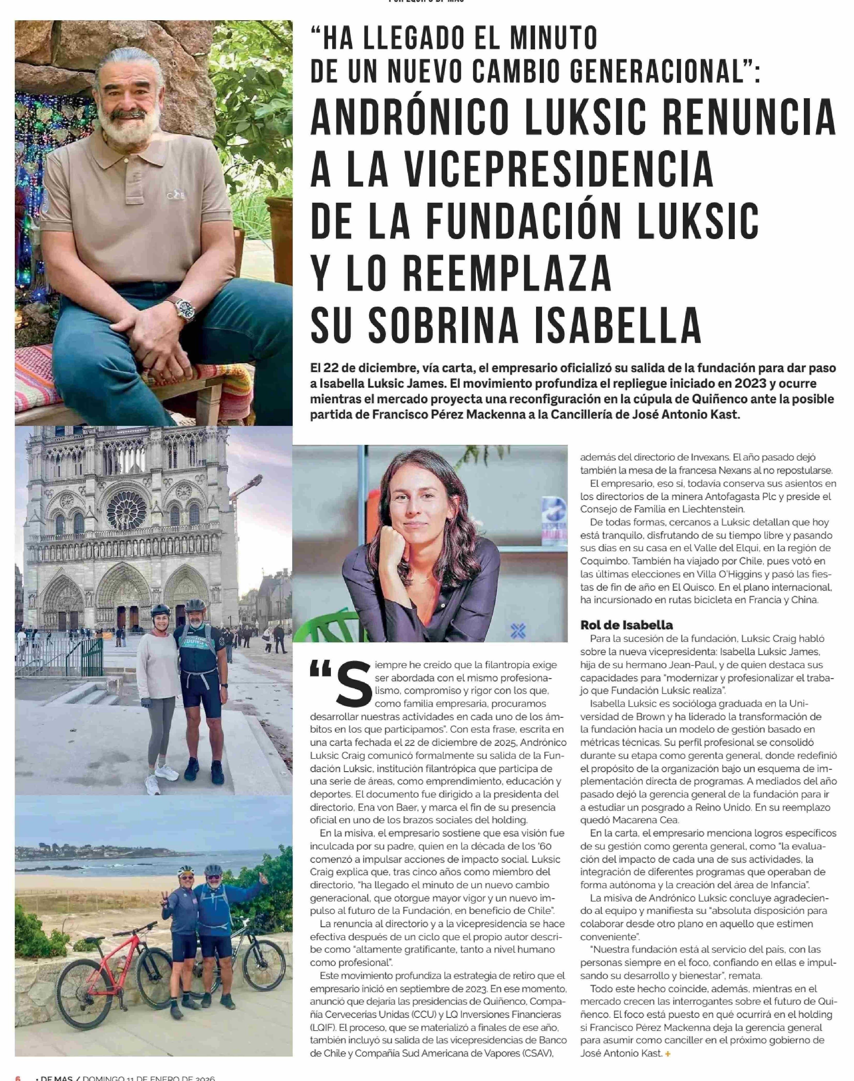 ANDRÓNICO LUKSIC RENUNCIA A LA VICEPRESIDENCIA DE LA FUNDACIÓN LUKSIC Y LO REEMPLAZA SU SOBRINA ISABELLA