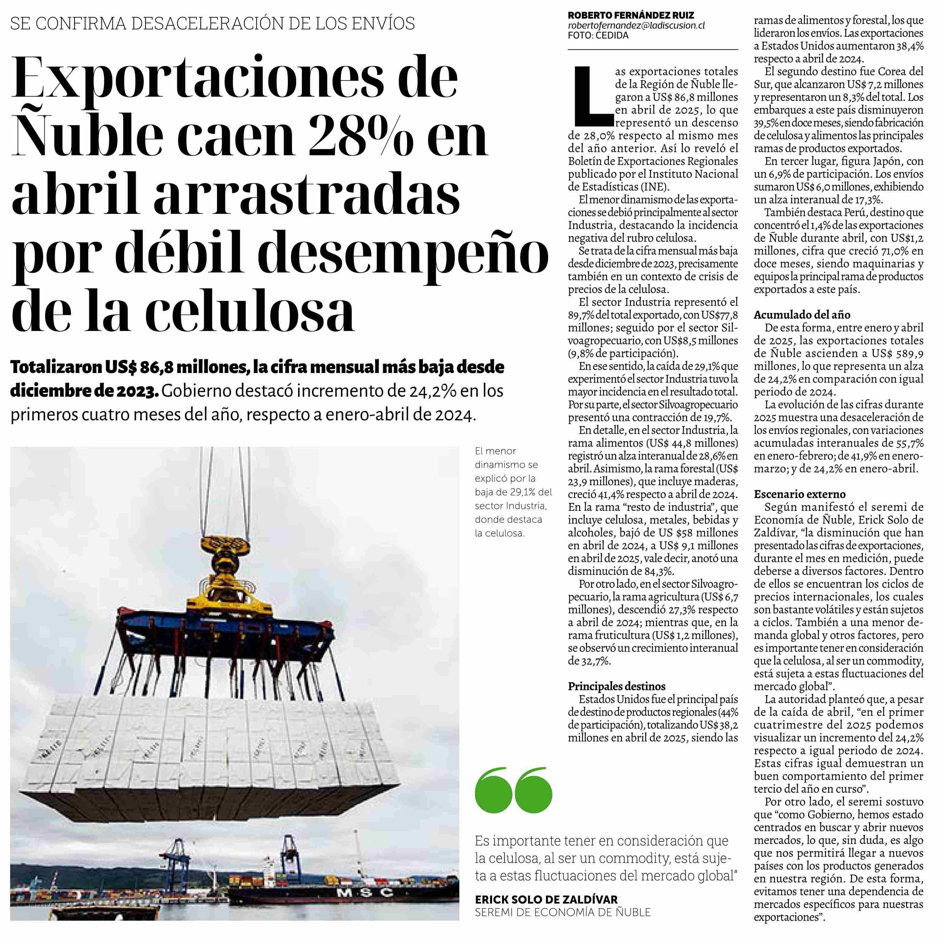 Exportaciones de Ñuble caen 28% en abril arrastradas por débil desempeño de la celulosa