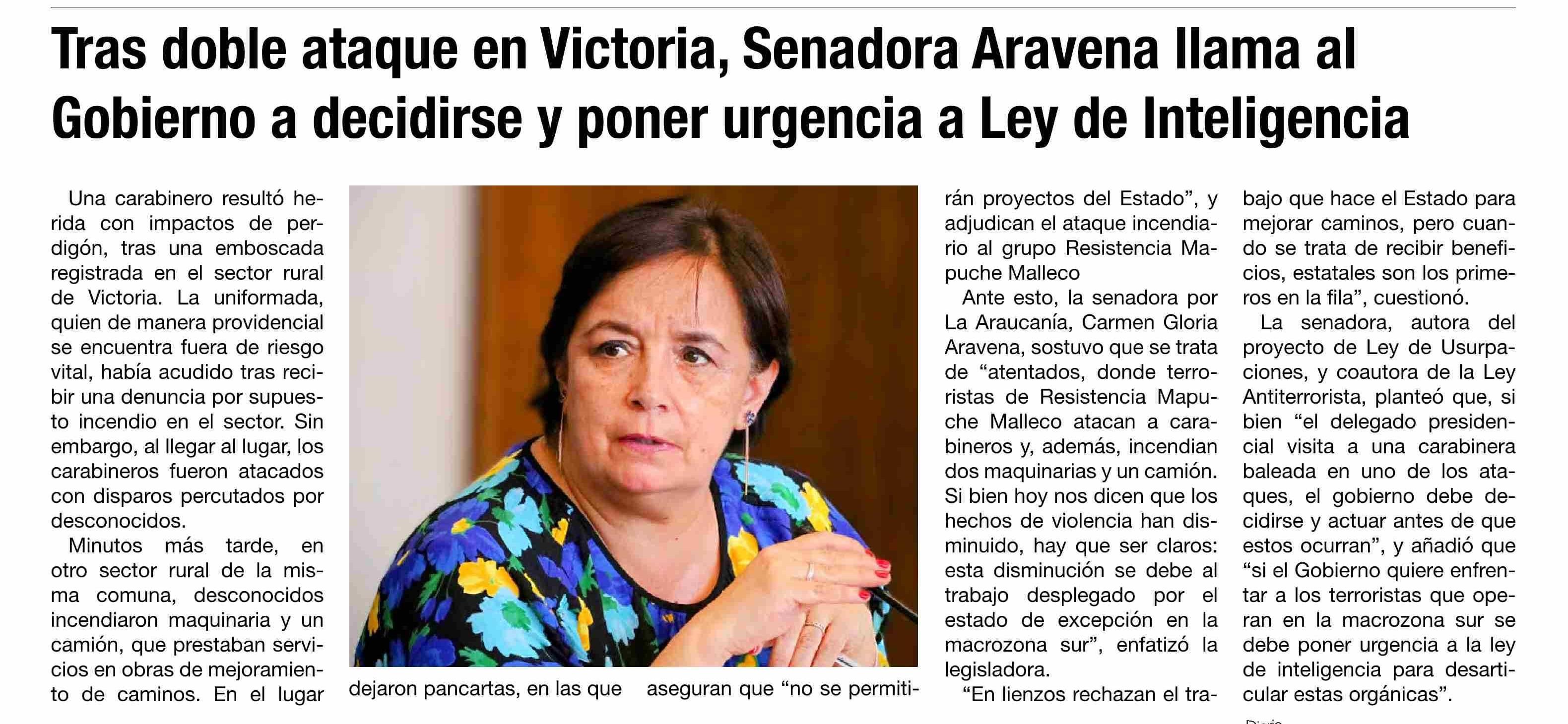 Tras doble ataque en Victoria, Senadora Aravena llama al Gobierno a decidirse y poner urgencia a Ley de Inteligencia