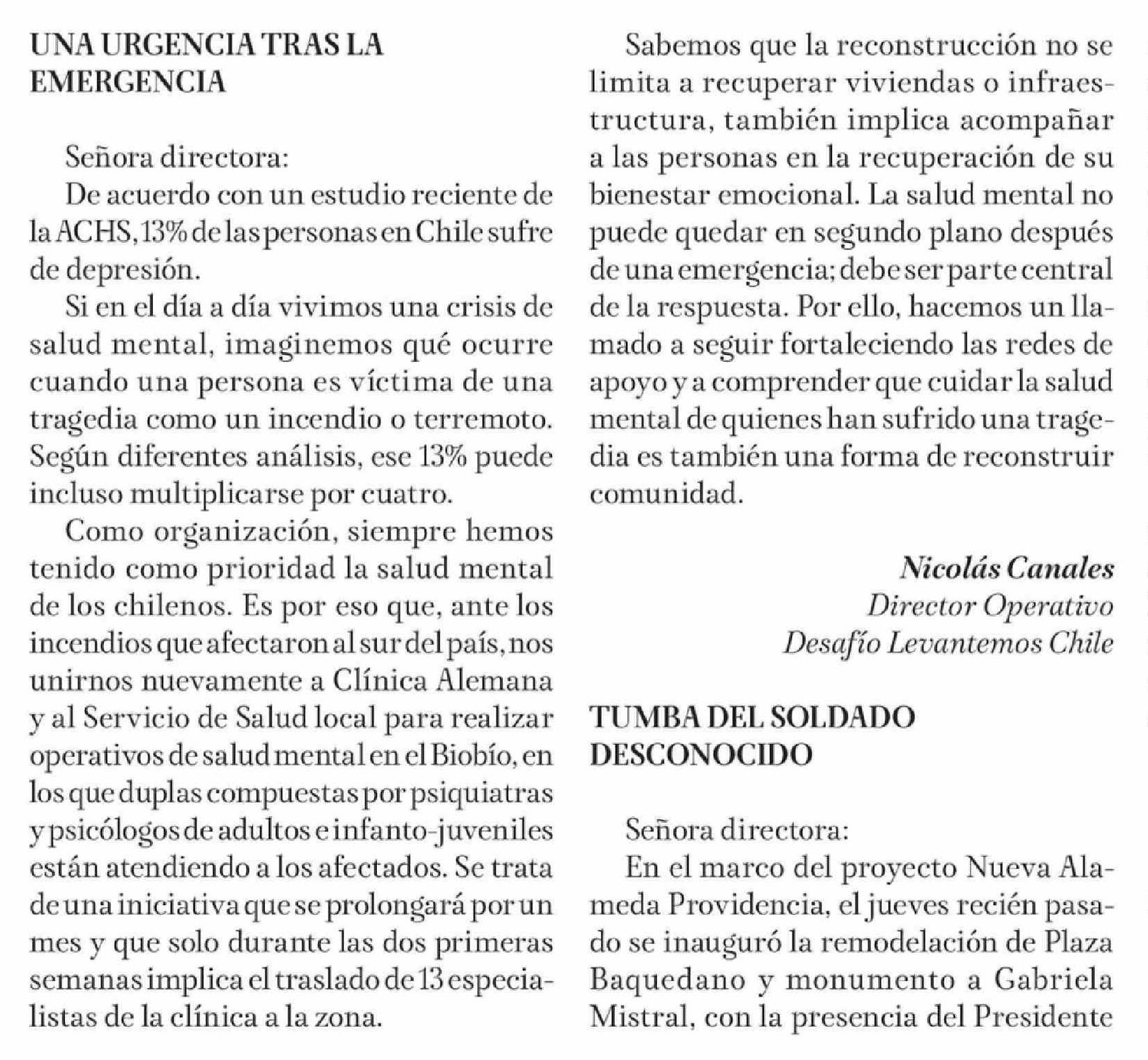 Cartas: UNA URGENCIA TRAS LA EMERGENCIA