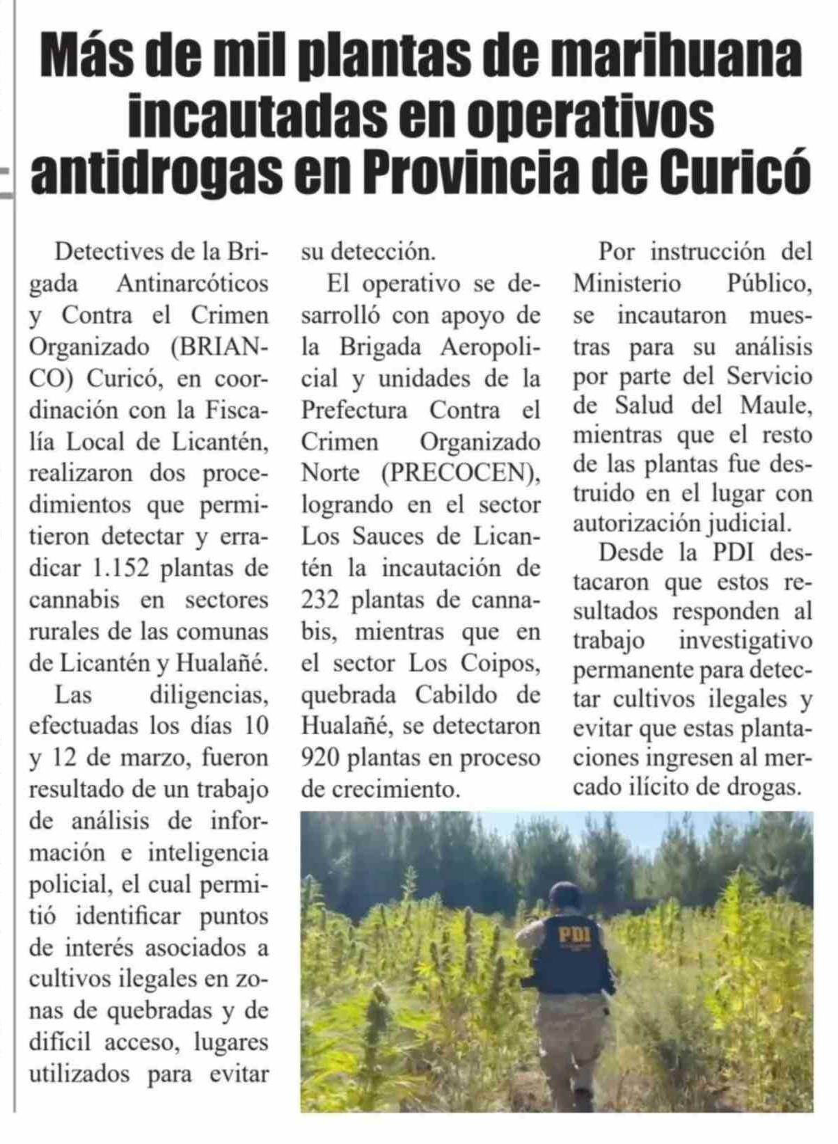 Más de mil plantas de marihuana incautadas en operativos antidrogas en Provincia de Curicó