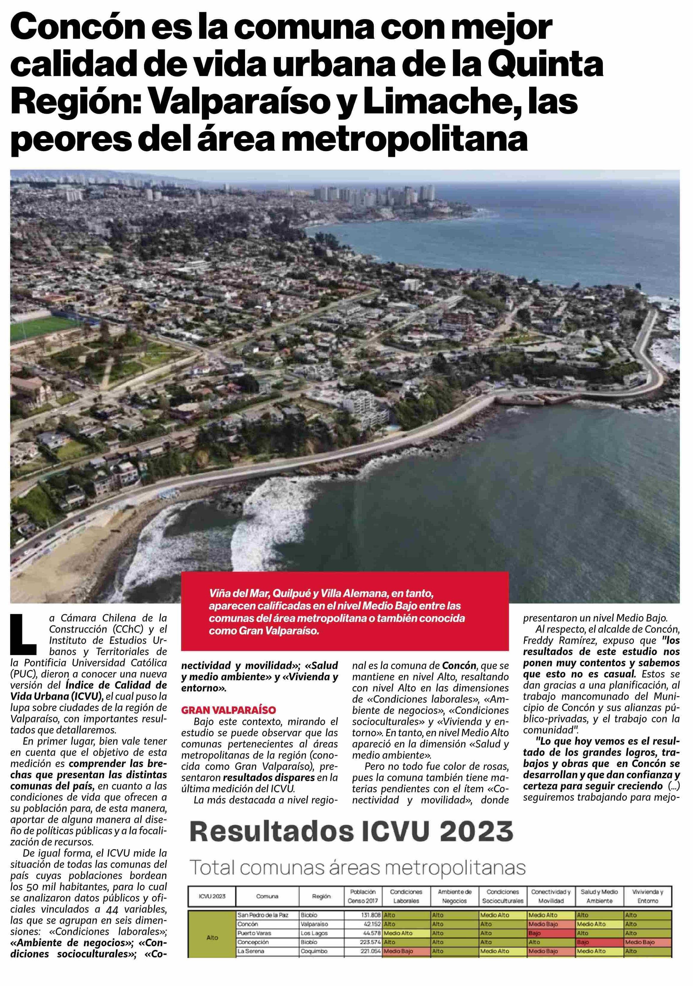 Concón es la comuna con mejor calidad de vida urbana de la Quinta Región: Valparaíso y Limache, las peores del área metropolitana