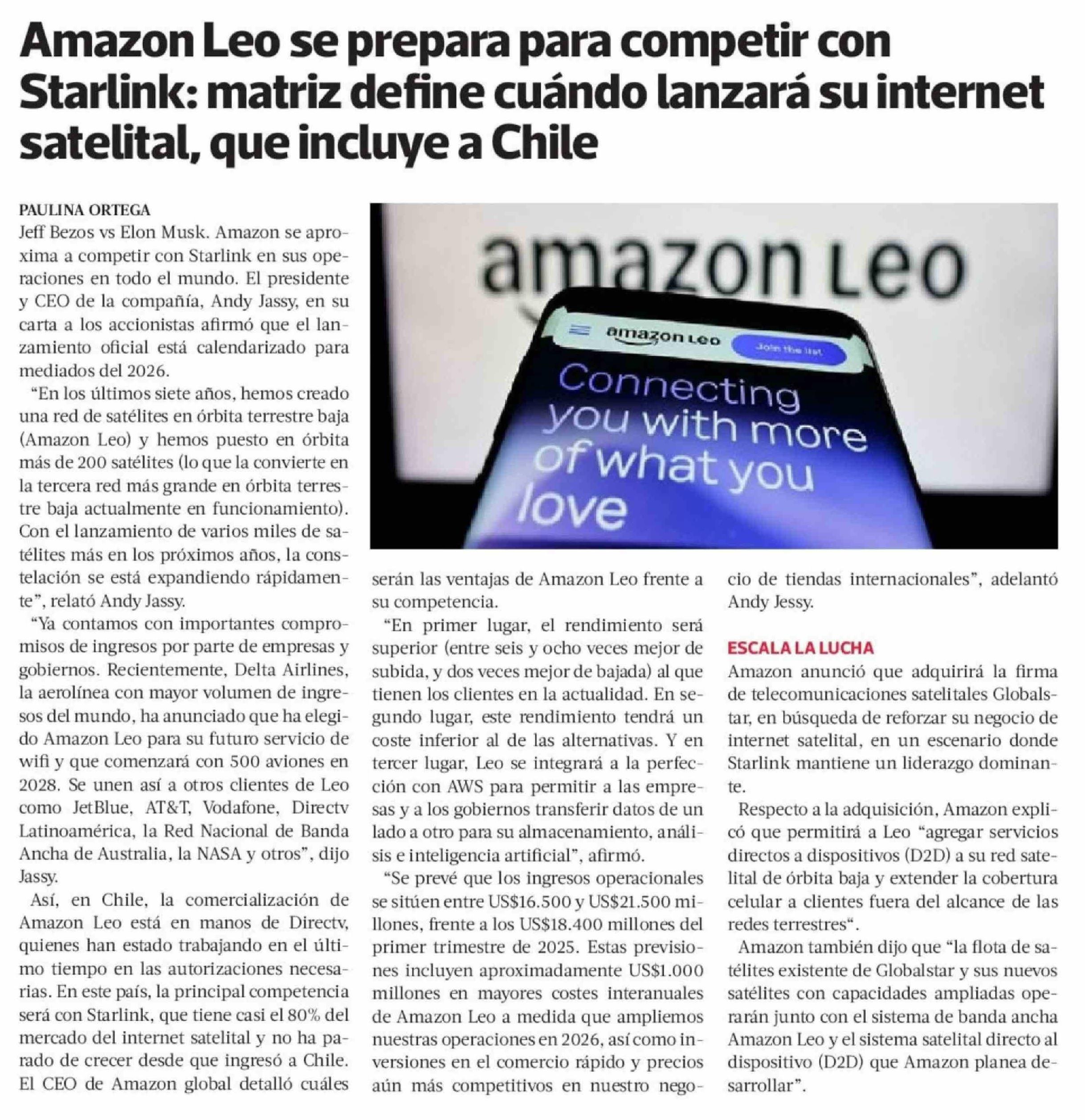 Título: Amazon Leo se prepara para competir con Starlink: matriz define cuándo lanzará su internet satelital, que incluye a Chile
