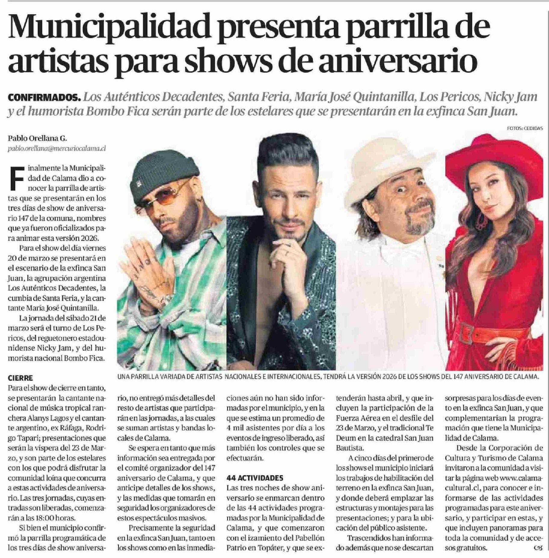 Municipalidad presenta parrilla de artistas para shows de aniversario