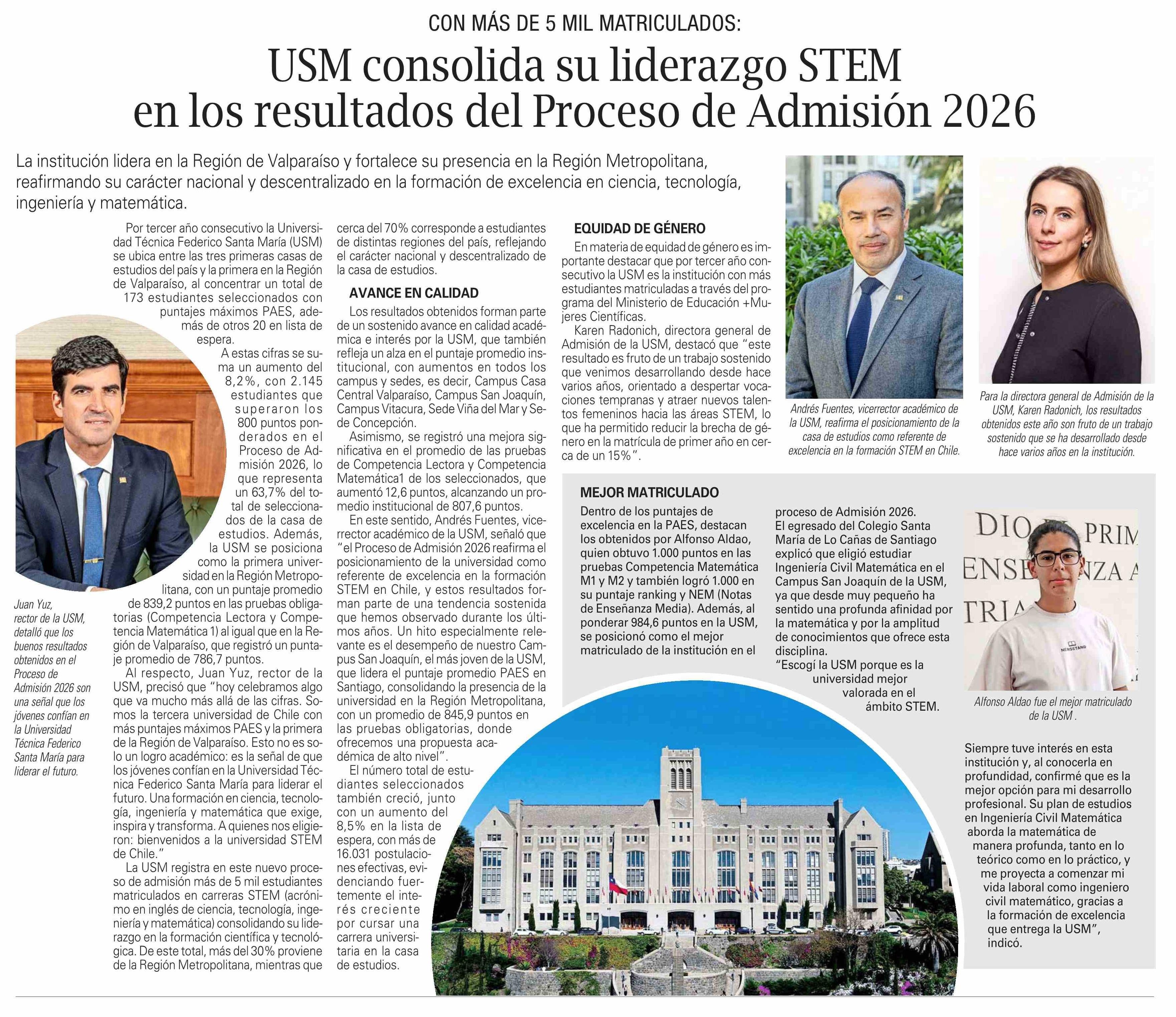 USM consolida su liderazgo STEM en los resultados del Proceso de Admisión 2026