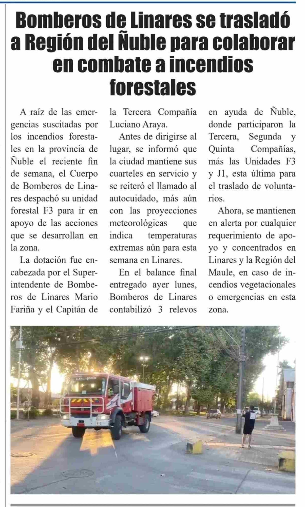 Bomberos de Linares se trasladó a Región del Ñuble para colaborar en combate a incendios forestales
