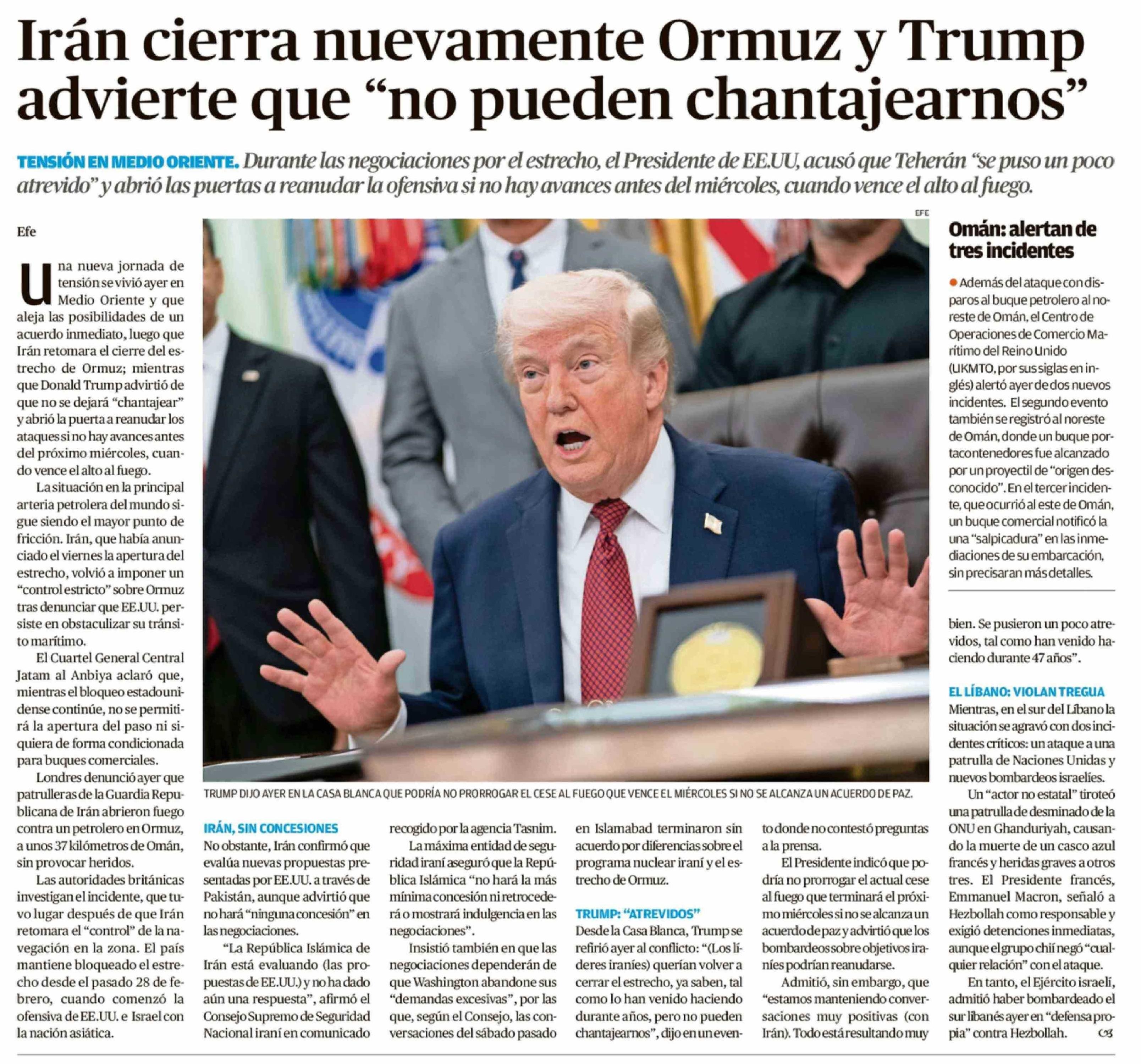 Iran cierra nuevamente Ormuz y Trump advierte que "no pueden chantajearnos"