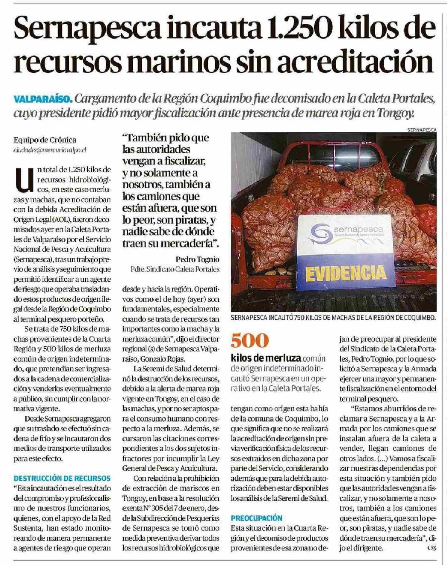 Sernapesca incauta 1.250 kilos de recursos marinos sin acreditación