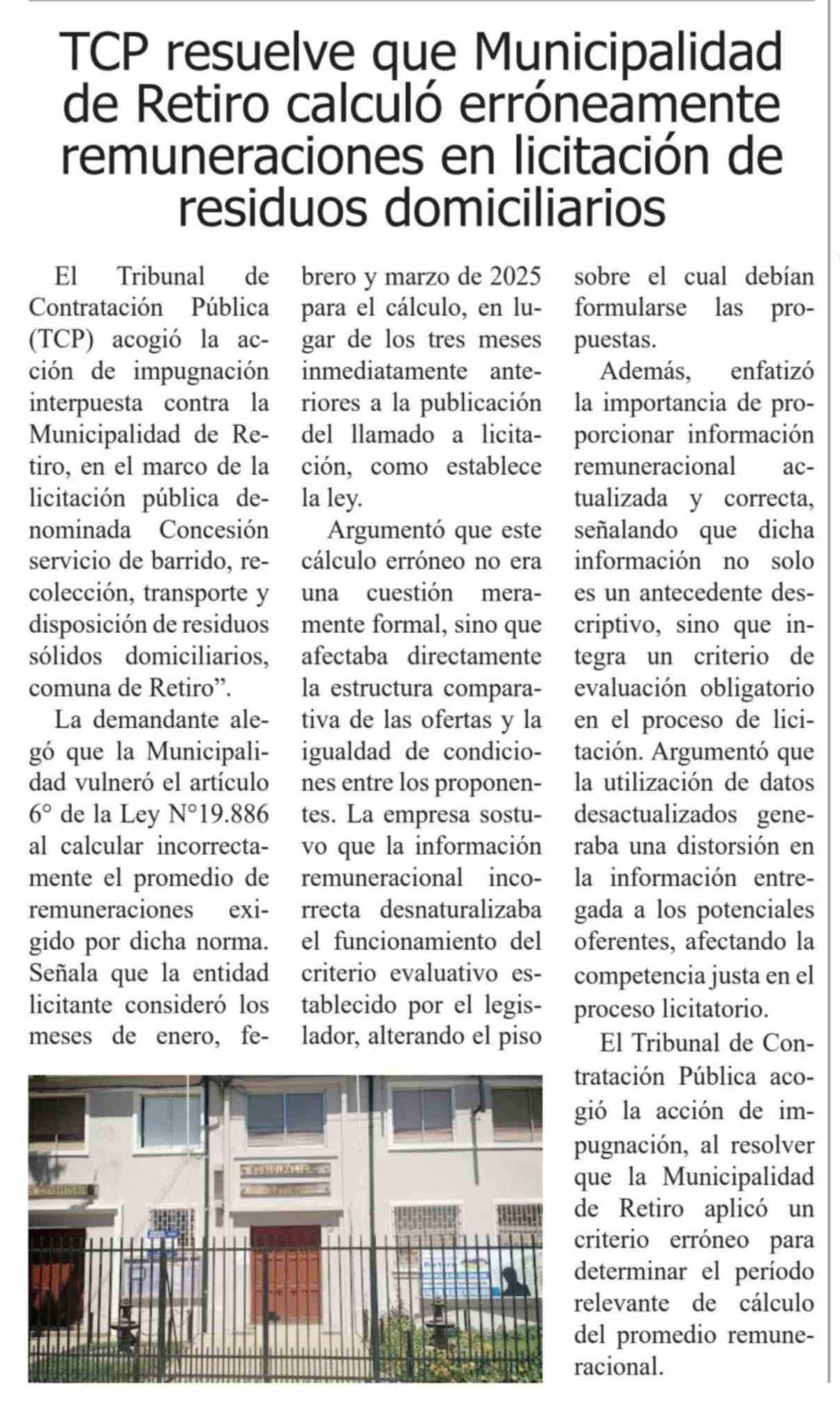 TCP resuelve que Municipalidad de Retiro calculó erróneamente remuneraciones en licitación de residuos domiciliarios