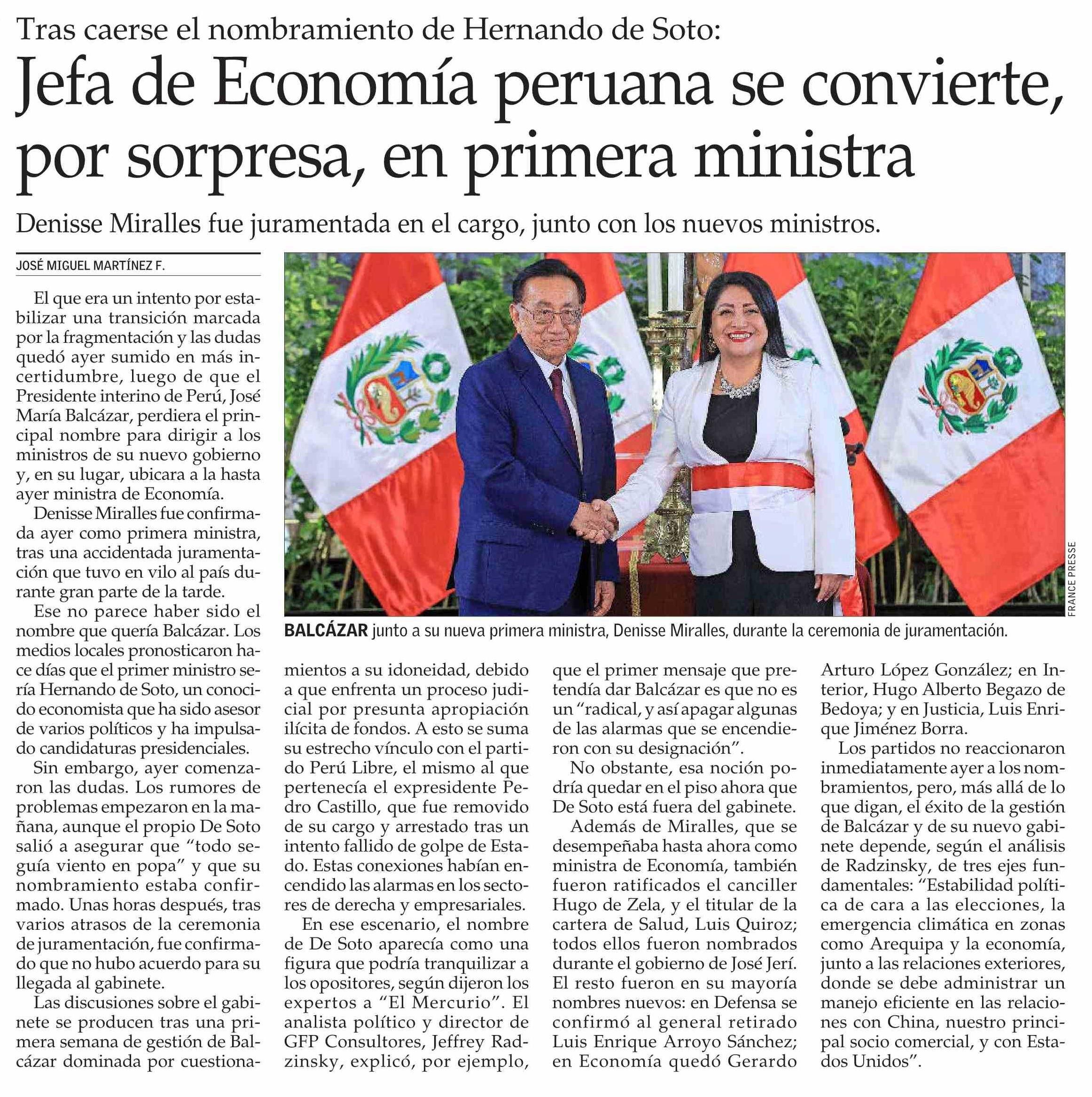 Jefa de Economía peruana se convierte, por sorpresa, en primera ministra