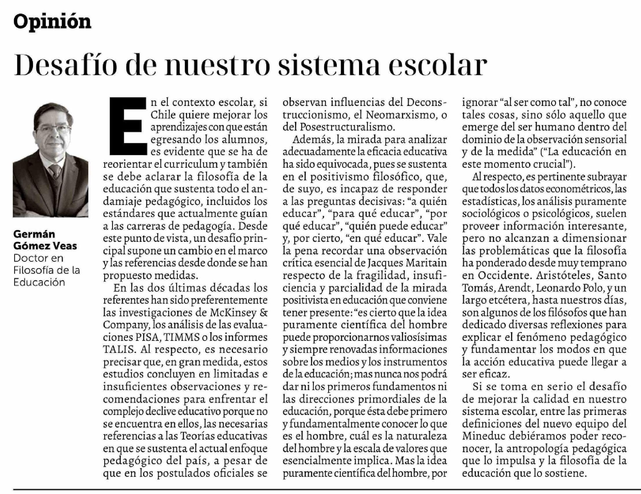 Columnas de Opinión: Desafío de nuestro sistema escolar