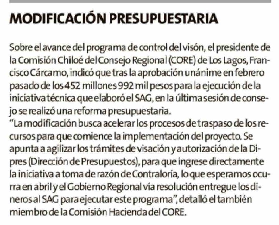 | Título: | MODIFICACIÓN PRESUPUESTARIA Sobre el avance del programa de control del visón, el presidente de la Comisión Chiloé del Consejo Regional (CORE) de Los Lagos, Francisco Cárcamo, indicó que tras la aprobación unánime en febrero pasado de los 452 millones 992 mil pesos para la ejecución de la iniciativa |