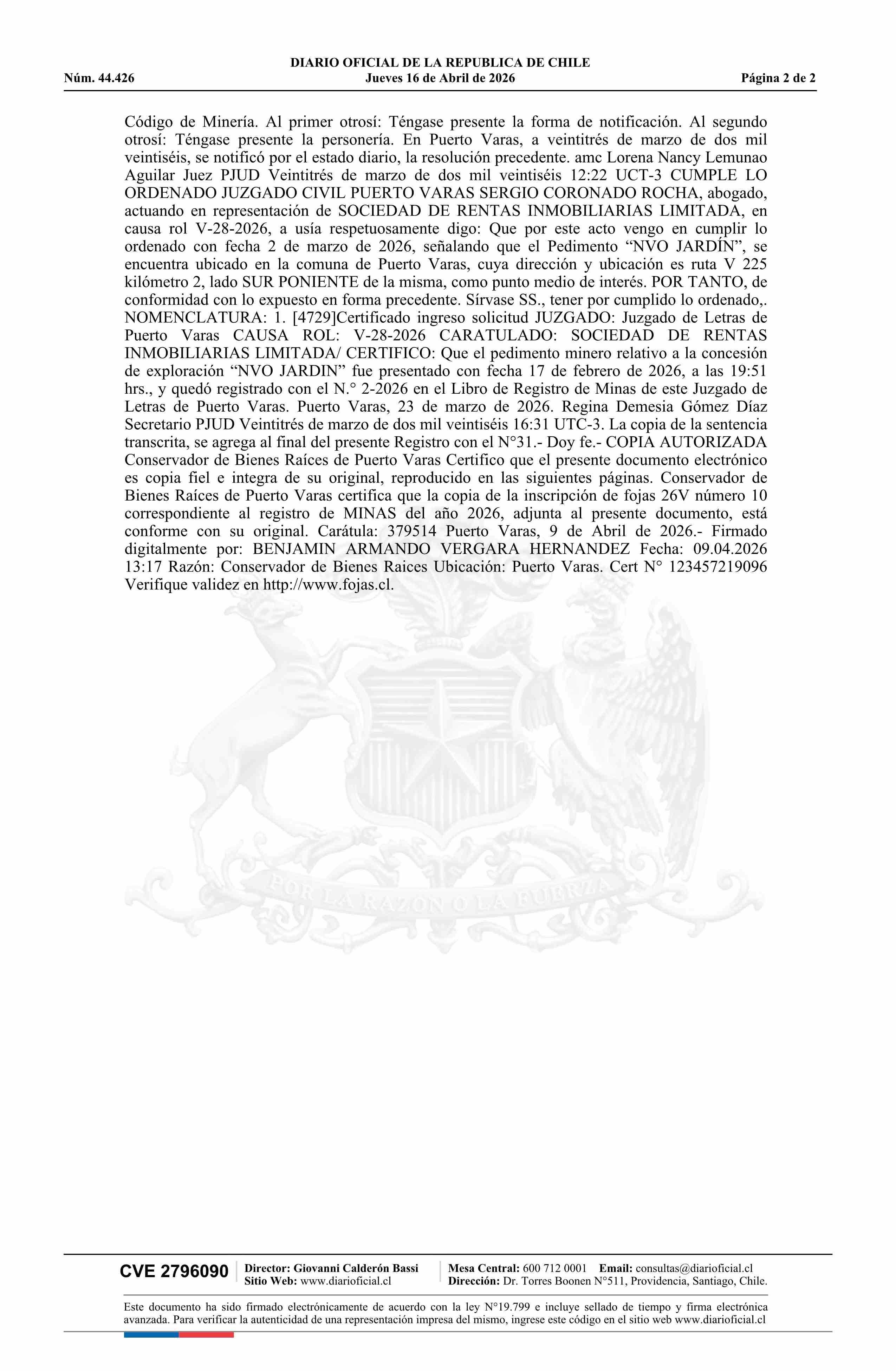 DIARIO OFICIAL CHILE - BOLETÍN OFICIAL DE MINERÍA (DIARIO OFICIAL CHILE – BOM – PEDIMENTOS MINEROS)