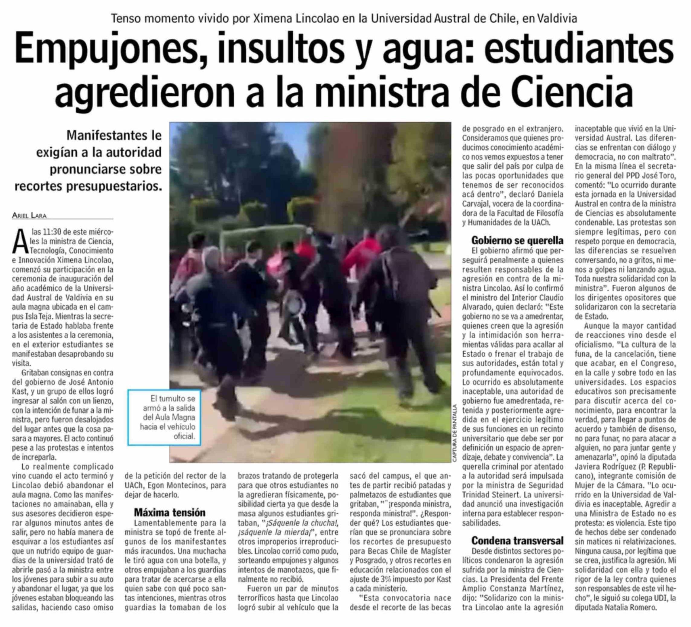 Título: Empujones, insultos y agua: estudiantes agredieron a la ministra de Ciencia