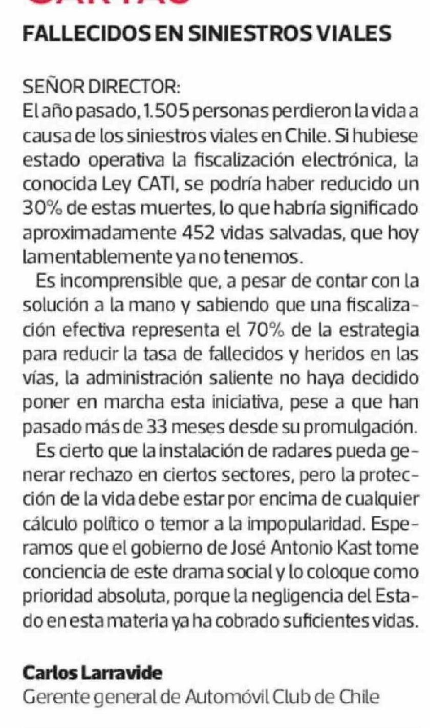 Cartas: FALLECIDOS EN SINIESTROS VIALES