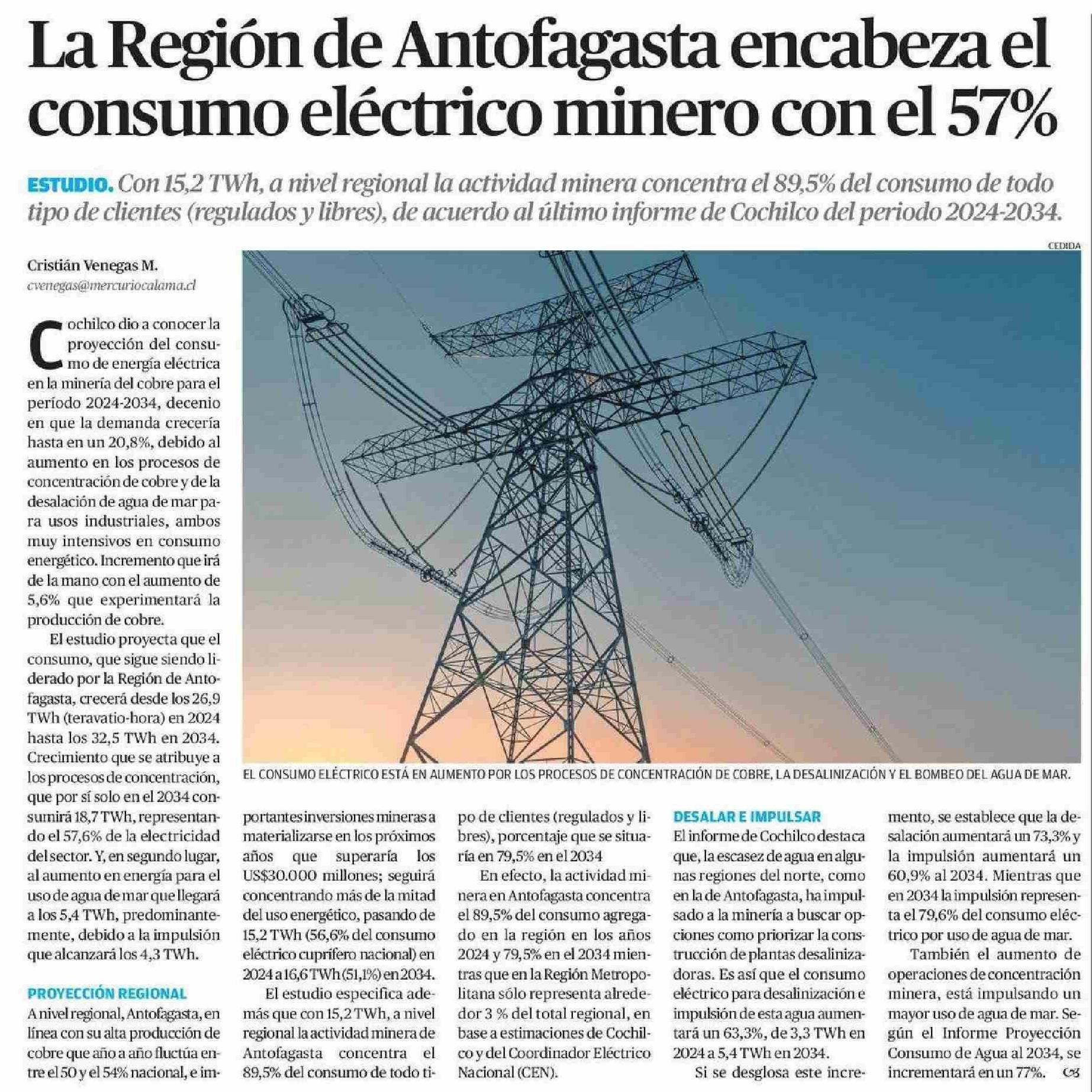 La Región de Antofagasta encabeza el consumo eléctrico minero con el 57%