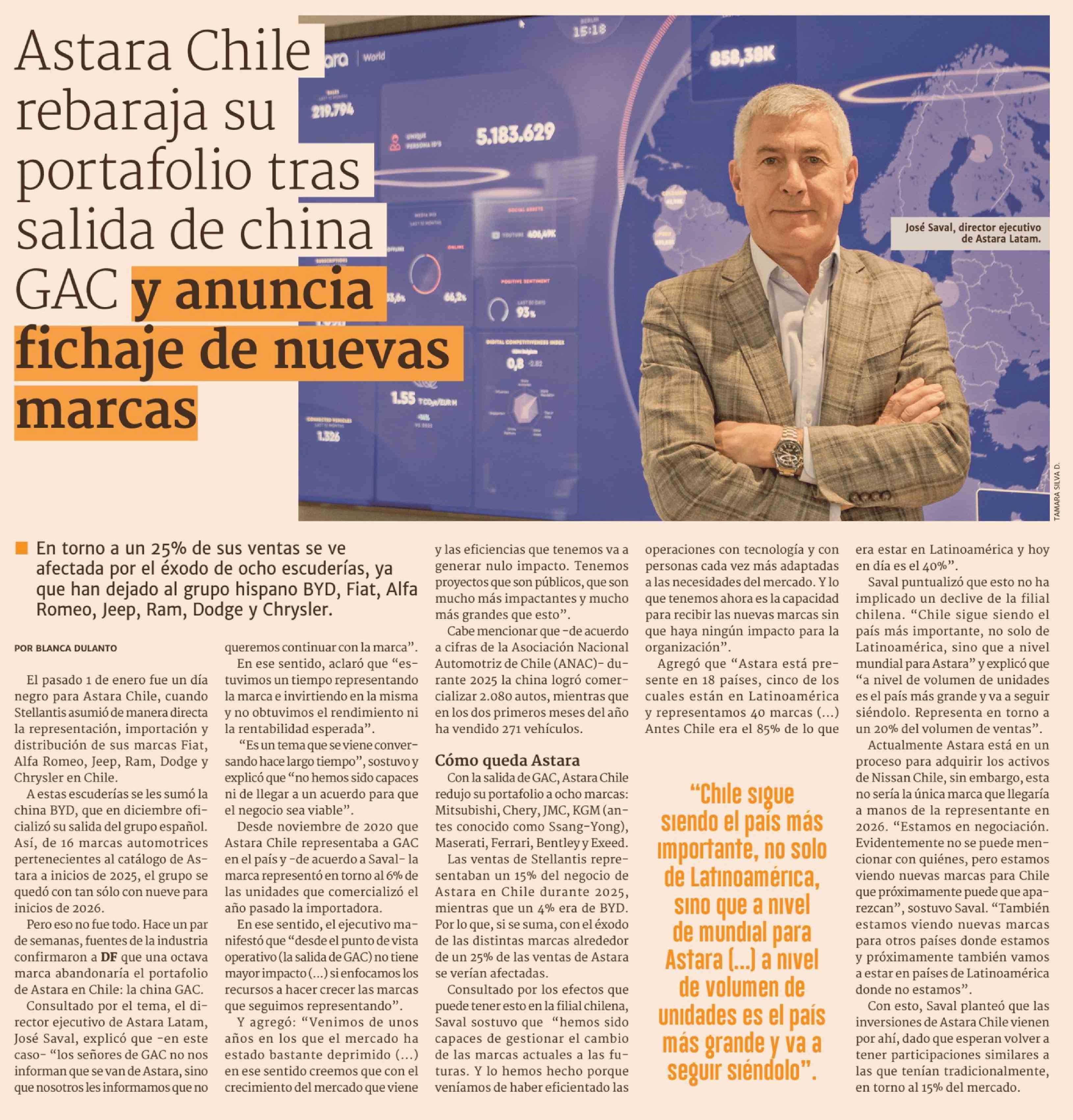 Astara Chile rebaraja su portafolio tras salida de china GAC y anuncia fichaje de nuevas marcas