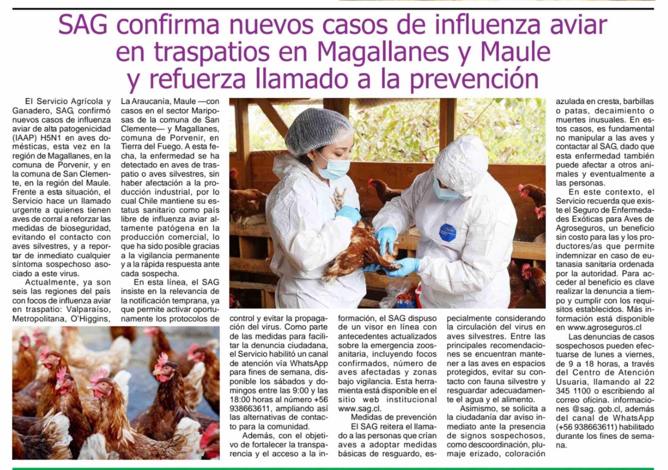 SAG confirma nuevos casos de influenza aviar en traspatios en Magallanes y Maule y refuerza llamado a la prevención