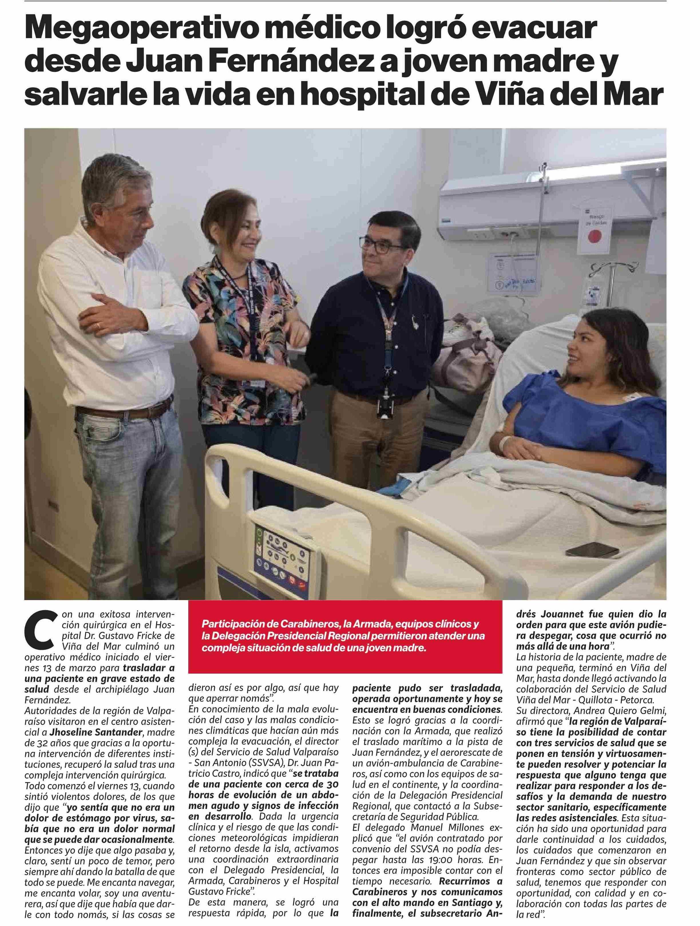 Megaoperativo médico logró evacuar desde Juan Fernández a joven madre y salvarle la vida en hospital de Viña del Mar