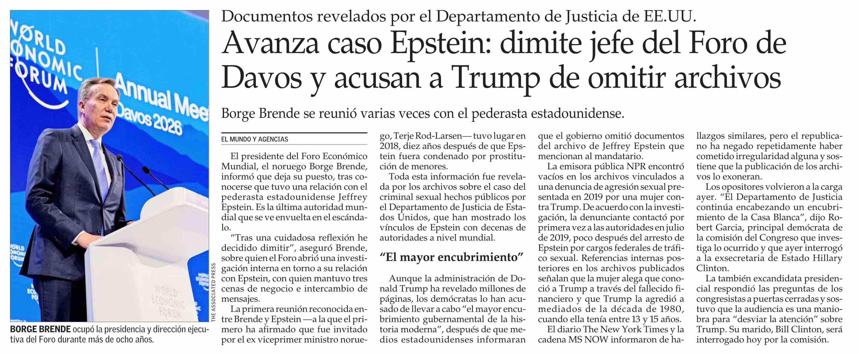 Avanza caso Epstein: dimite jefe del Foro de Davos y acusan a Trump de omitir archivos