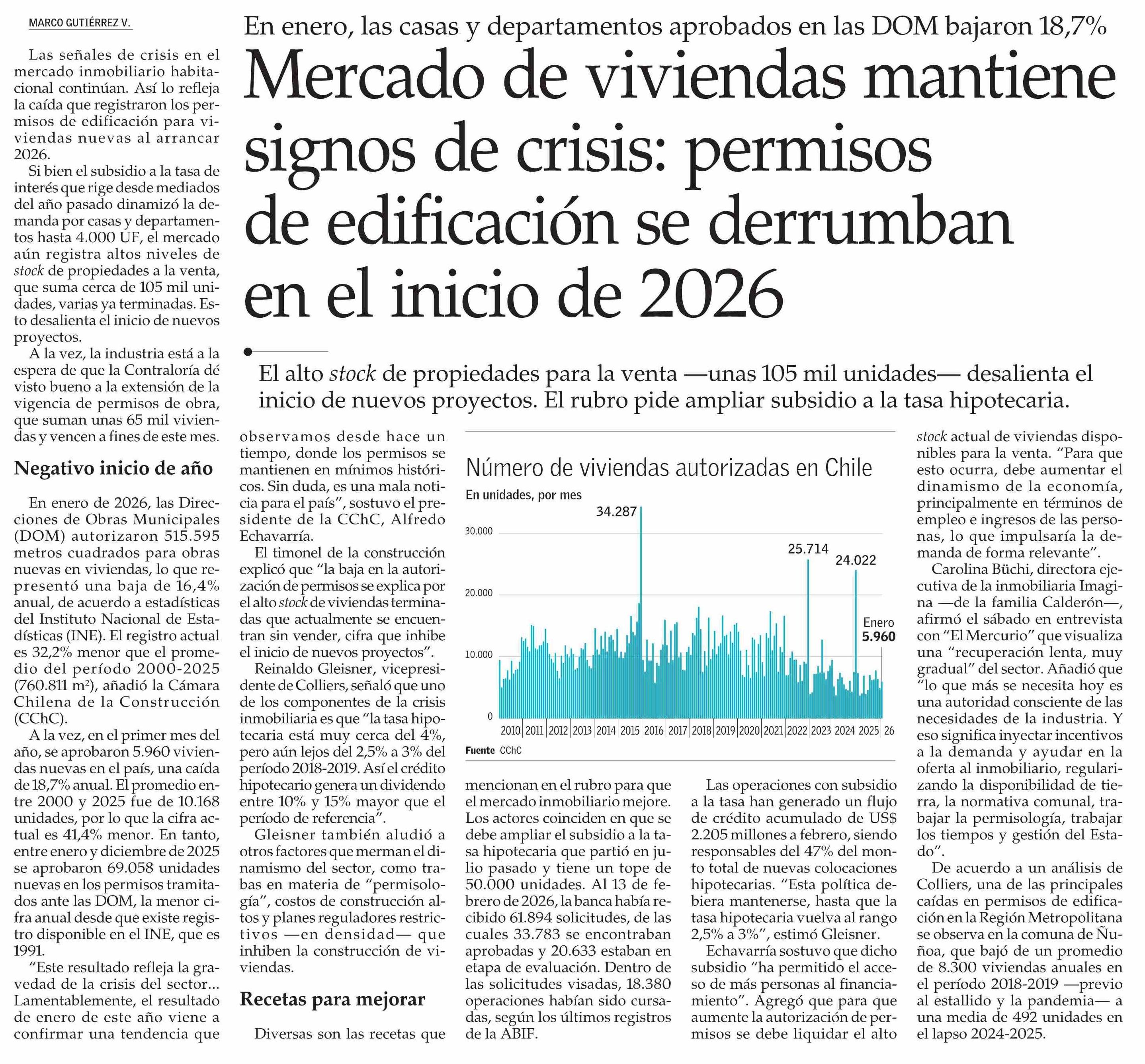 Mercado de viviendas mantiene signos de crisis: permisos de edificación se derrumban en el inicio de 2026
