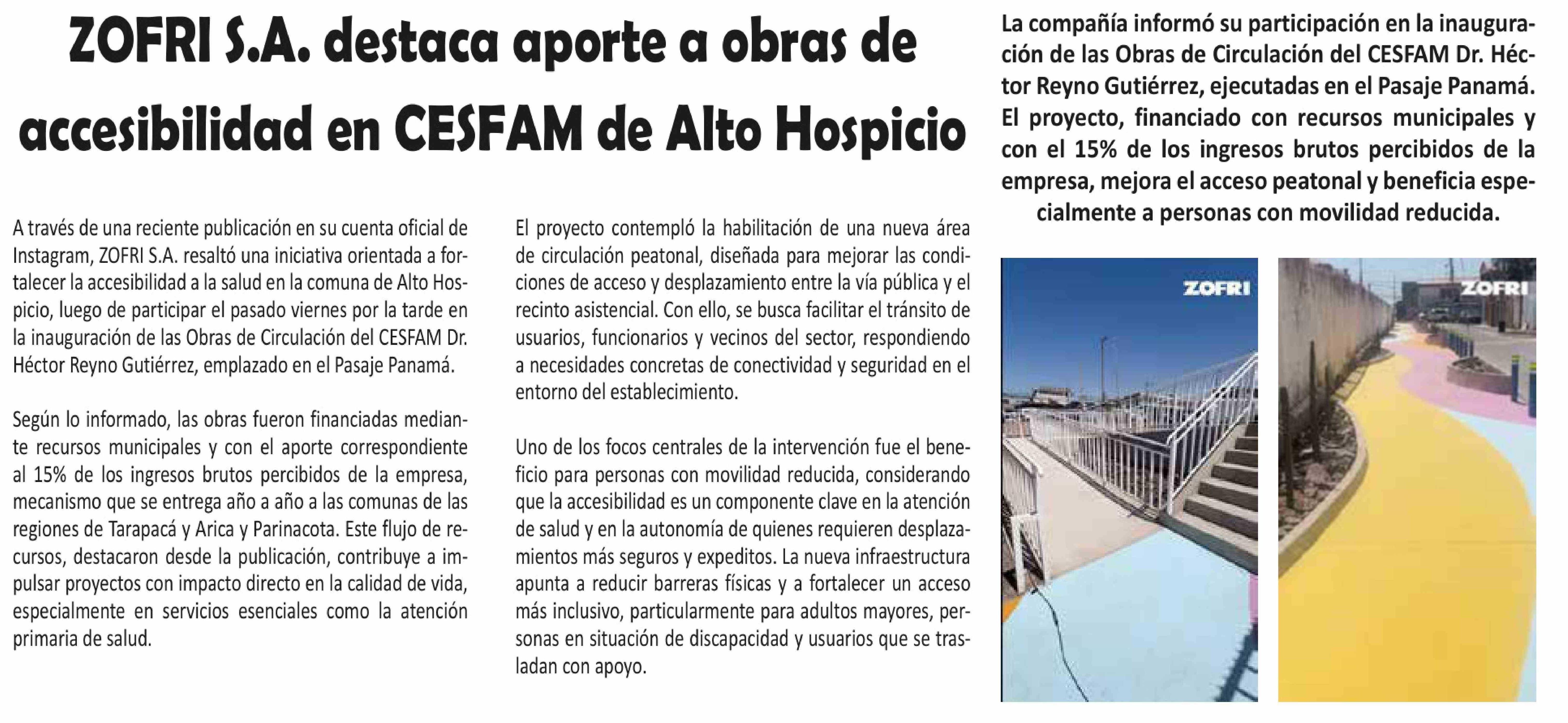 ZOFRI S.A. destaca aporte a obras de accesibilidad en CESFAM de Alto Hospicio
