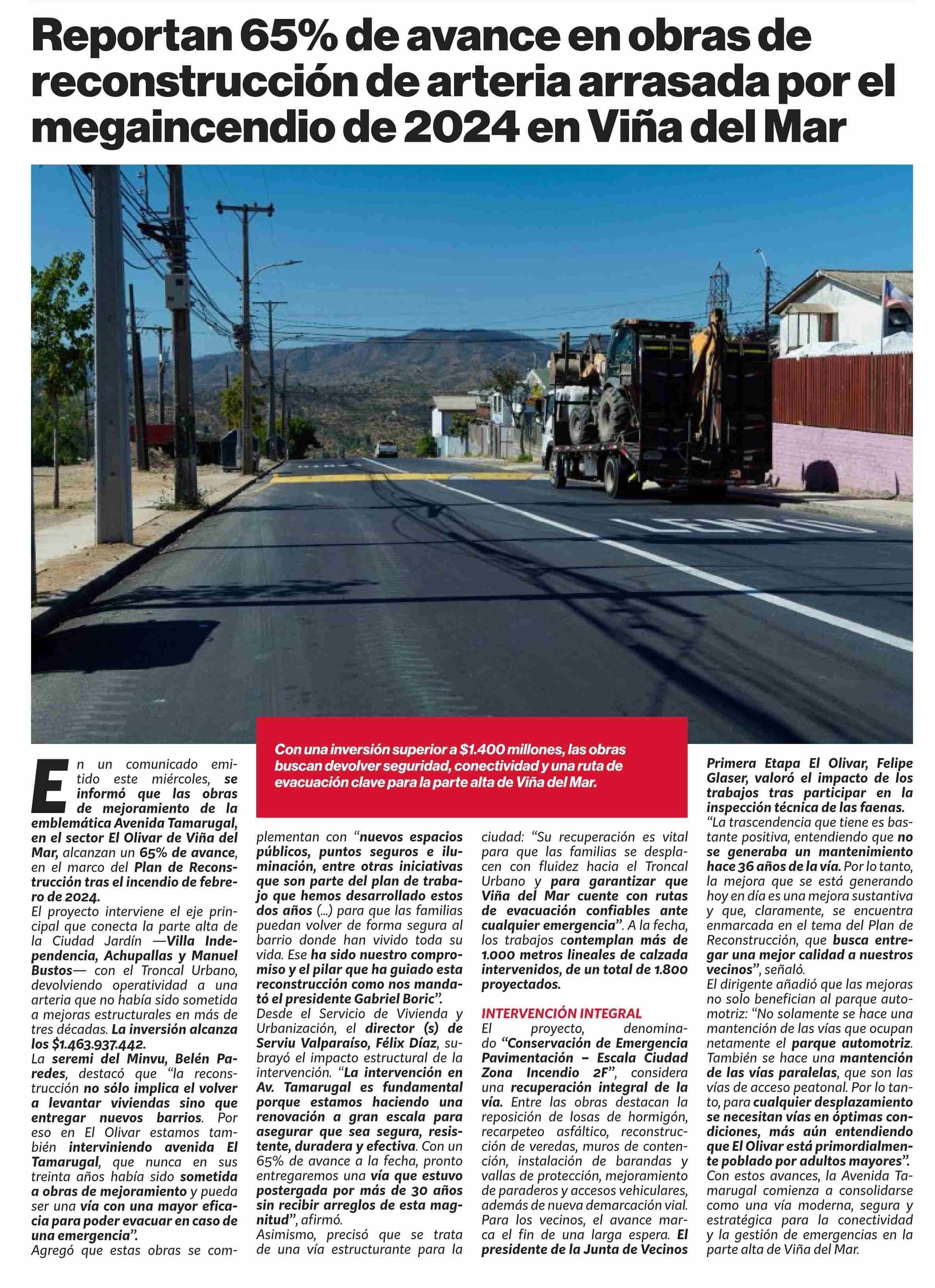 Reportan 65% de avance en obras de reconstrucción de arteria arrasada por el megaincendio de 2024 en Viña del Mar