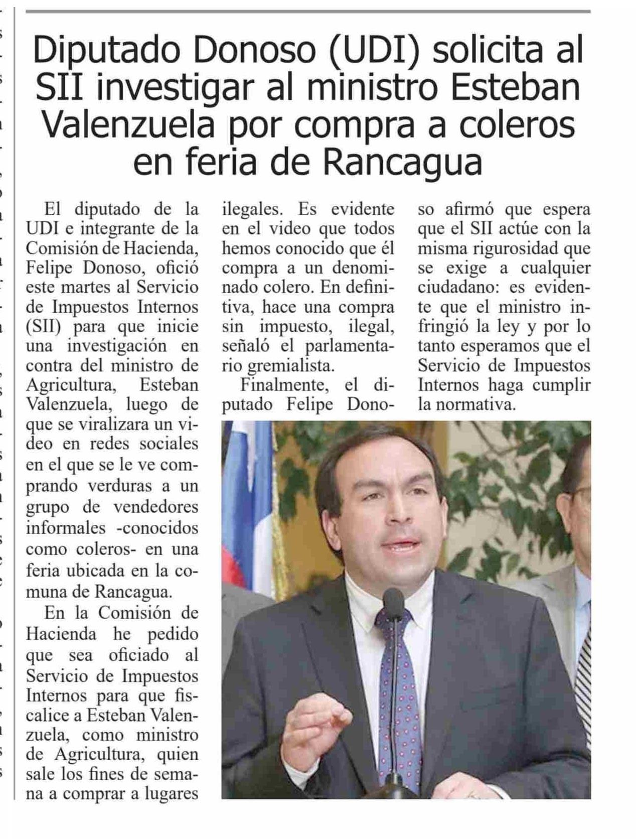 Diputado Donoso (UDI) solicita al SI investigar al ministro Esteban Valenzuela por compra a coleros en feria de Rancagua