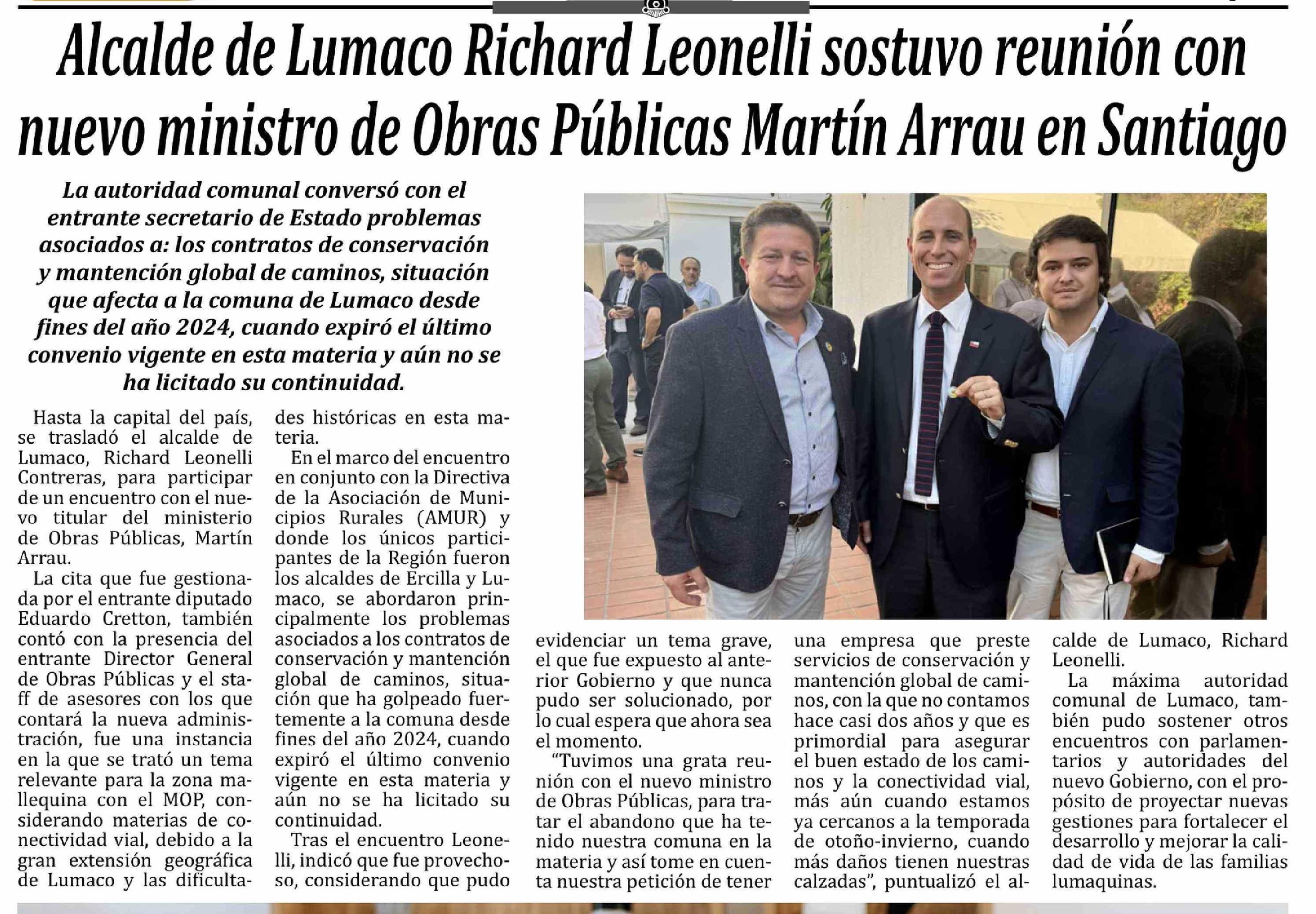 Alcalde de Lumaco Richard Leonelli sostuvo reunión con nuevo ministro de Obras Públicas Martín Arrau en Santiago