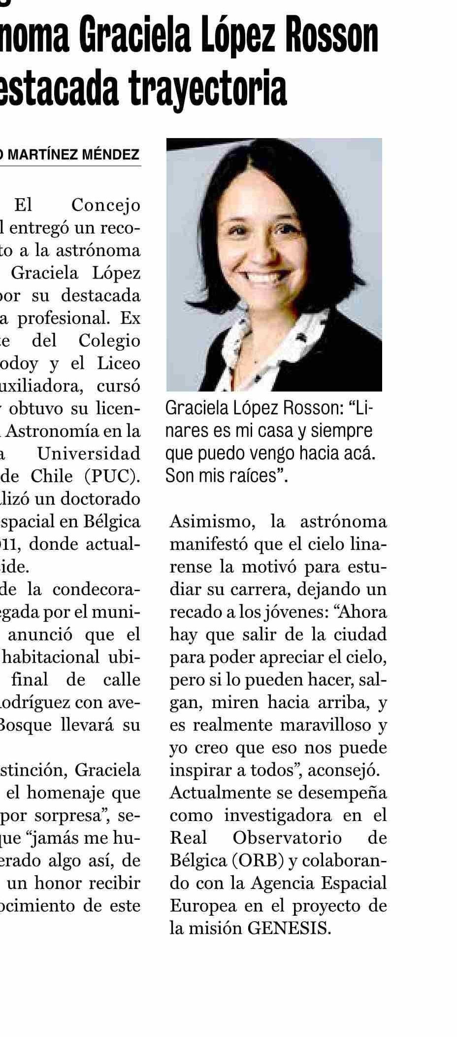 Concejo Municipal de Linares entregó reconocimiento a astrónoma Graciela López Rosson por destacada trayectoria