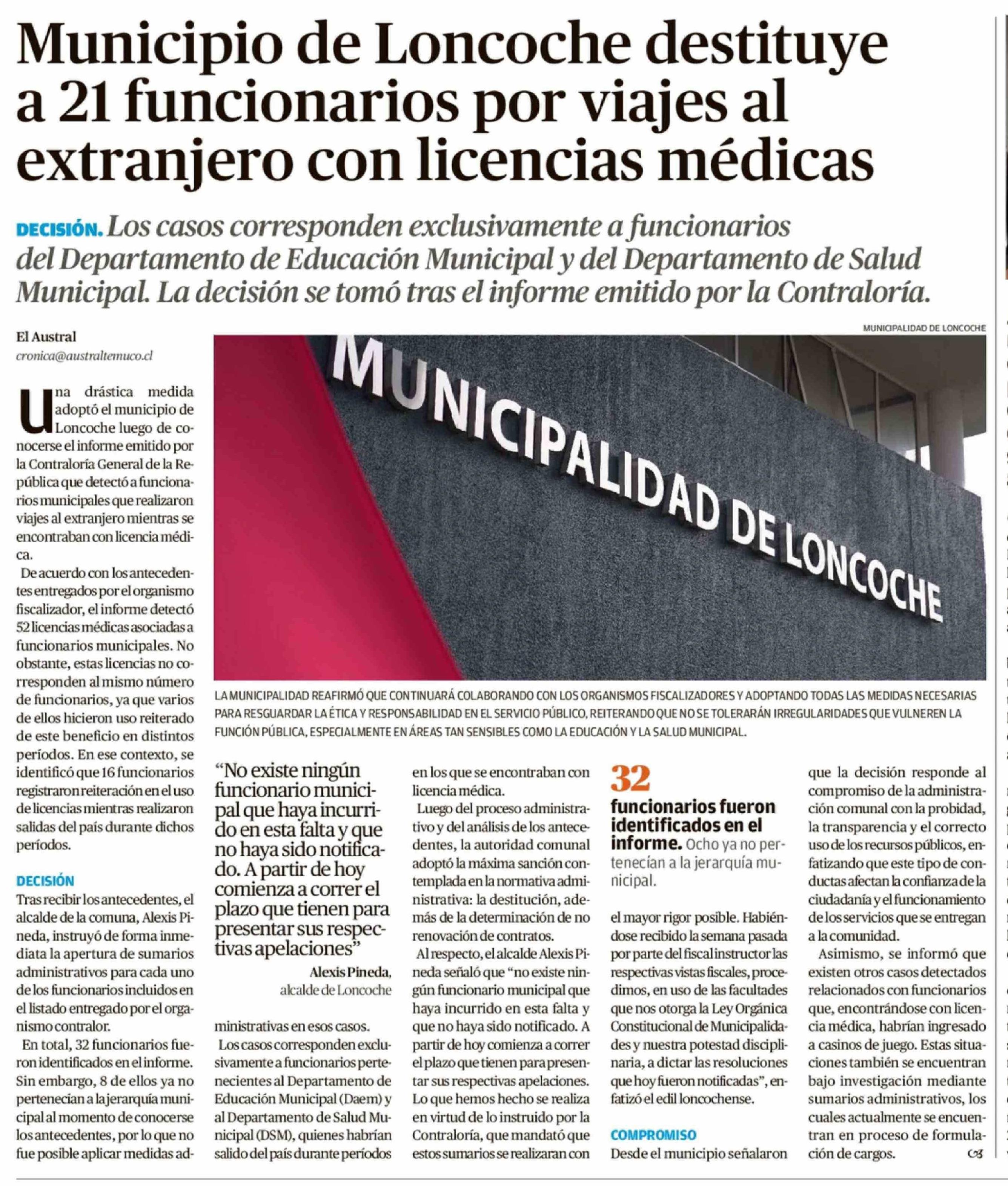 Municipio de Loncoche destituye a 21 funcionarios por viajes al extranjero con licencias médicas