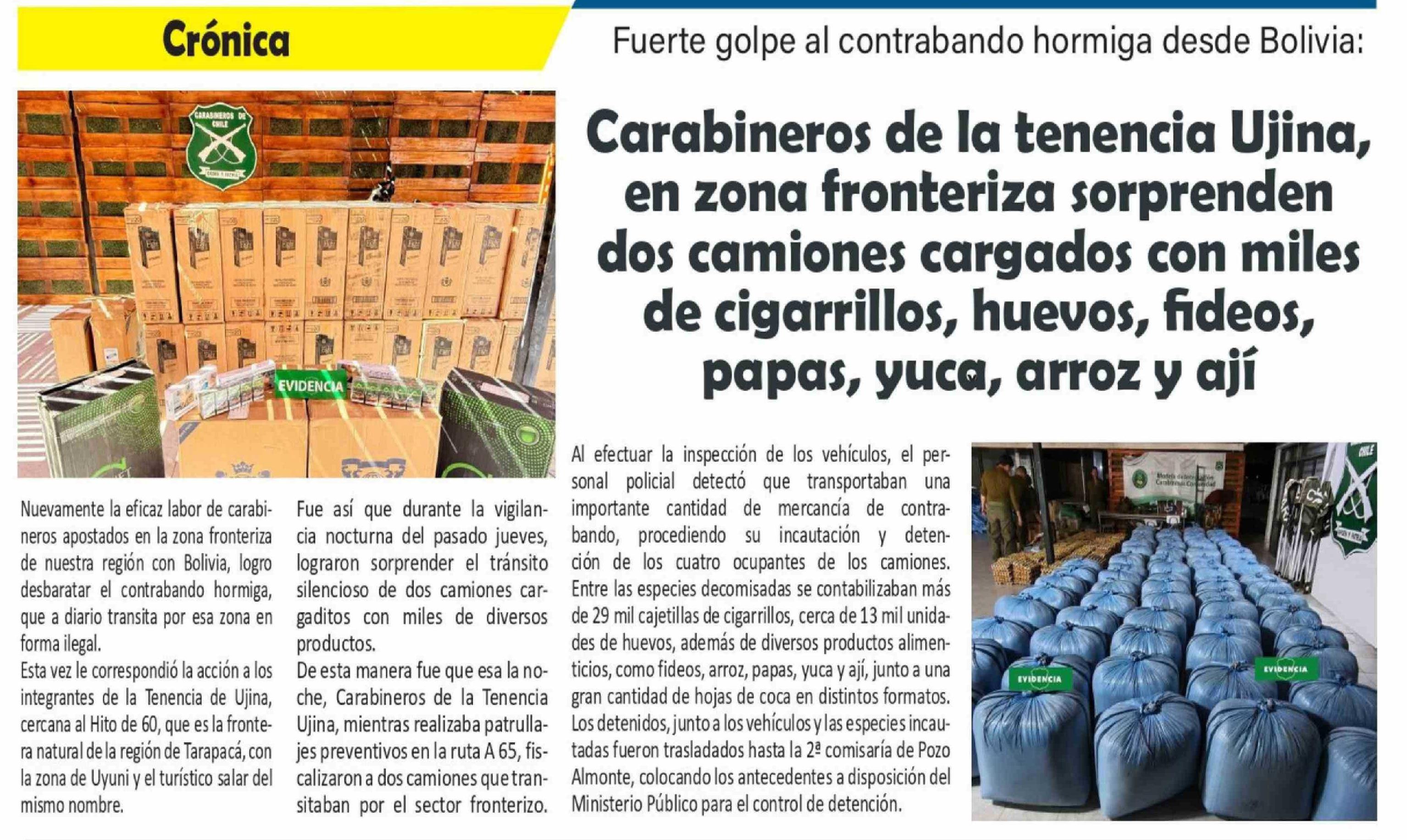 Carabineros de la tenencia Ujina, en zona fronteriza sorprenden dos camiones cargados con miles de cigarrillos, huevos, fideos, papas, yuca, arroz y ají