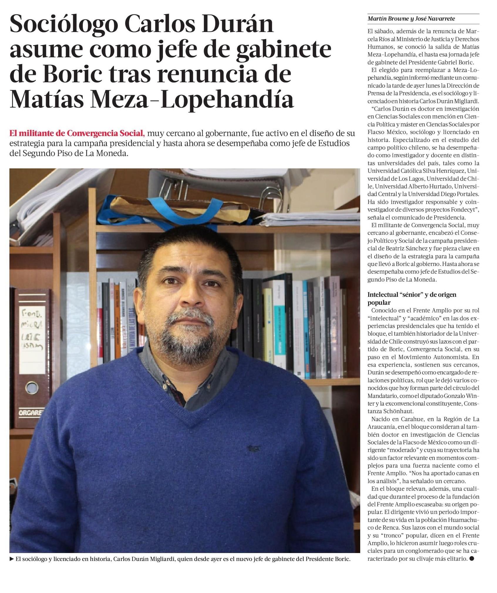 Sociólogo Carlos Durán asume como jefe de gabinete de Boric tras renuncia de Matías Meza-Lopehandía