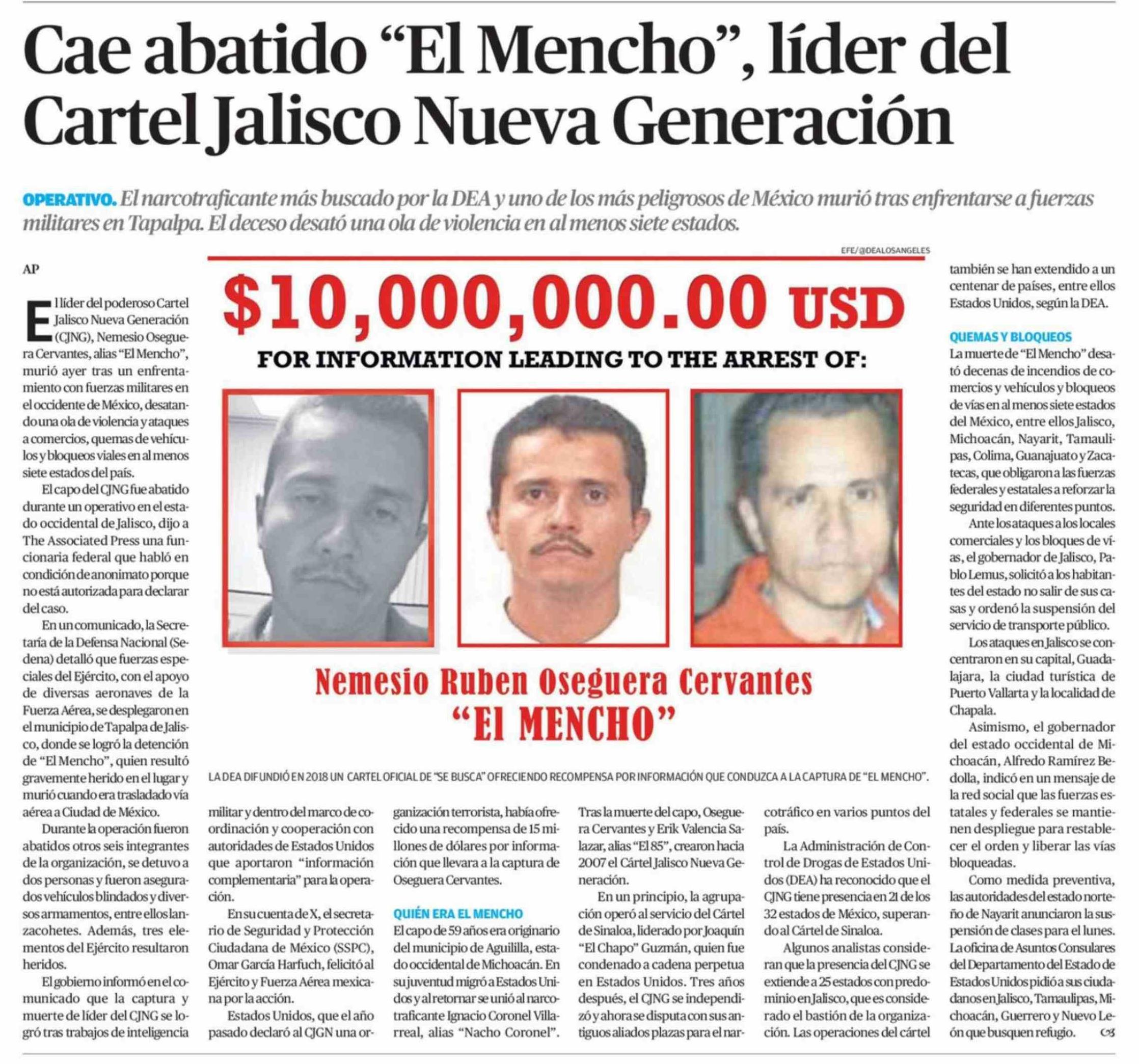 Cae abatido "El Mencho", líder del Cartel Jalisco Nueva Generación