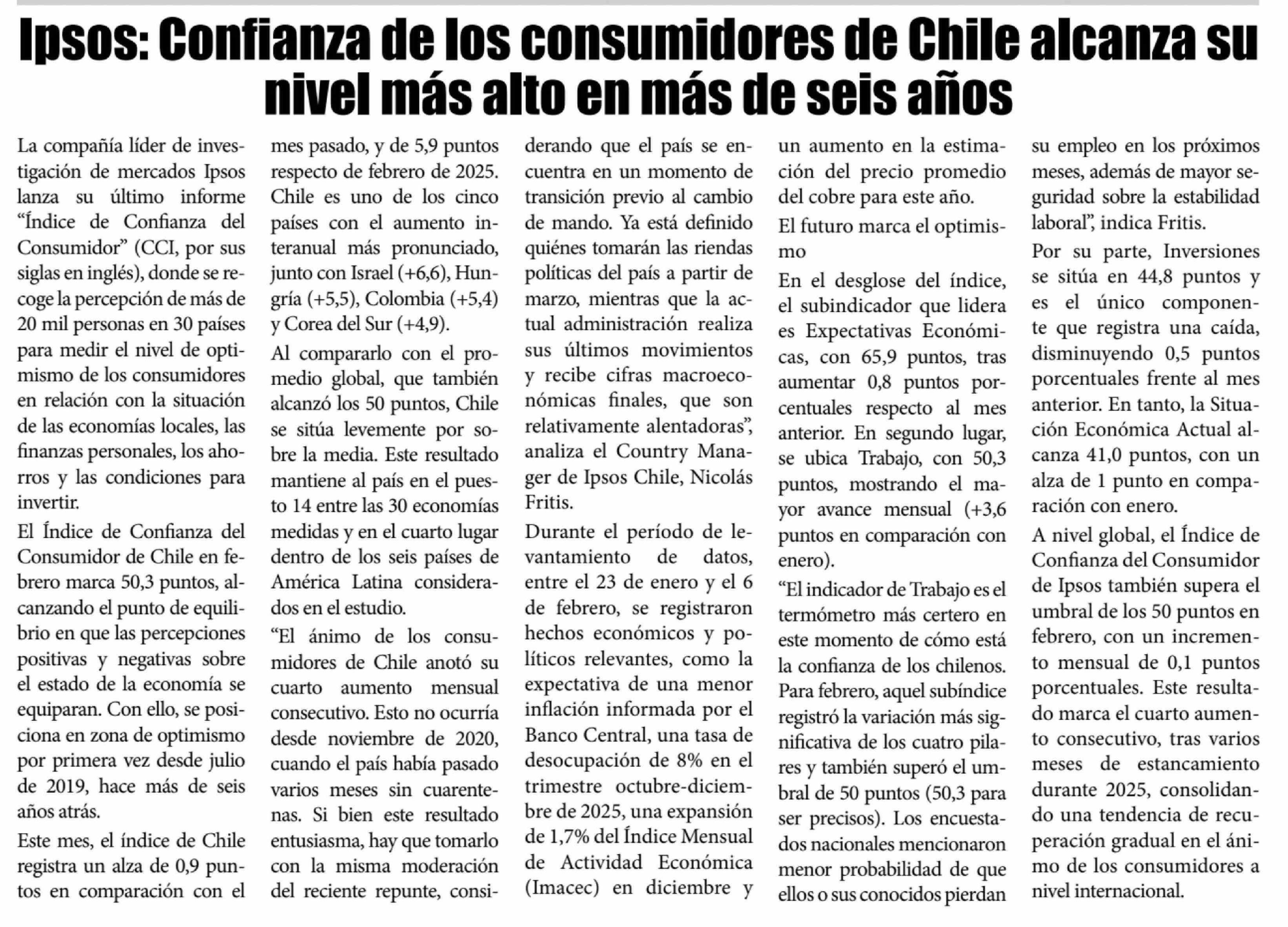 Ipsos: Confianza de los consumidores de Chile alcanza su nivel más alto en más de seis años