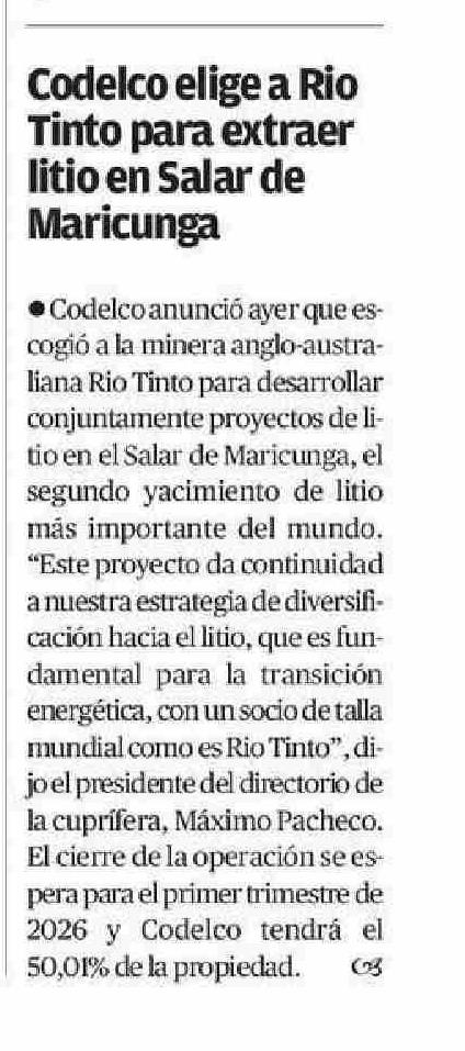 Codelco elige a Río Tinto para extraer litio en Salar de Maricunga