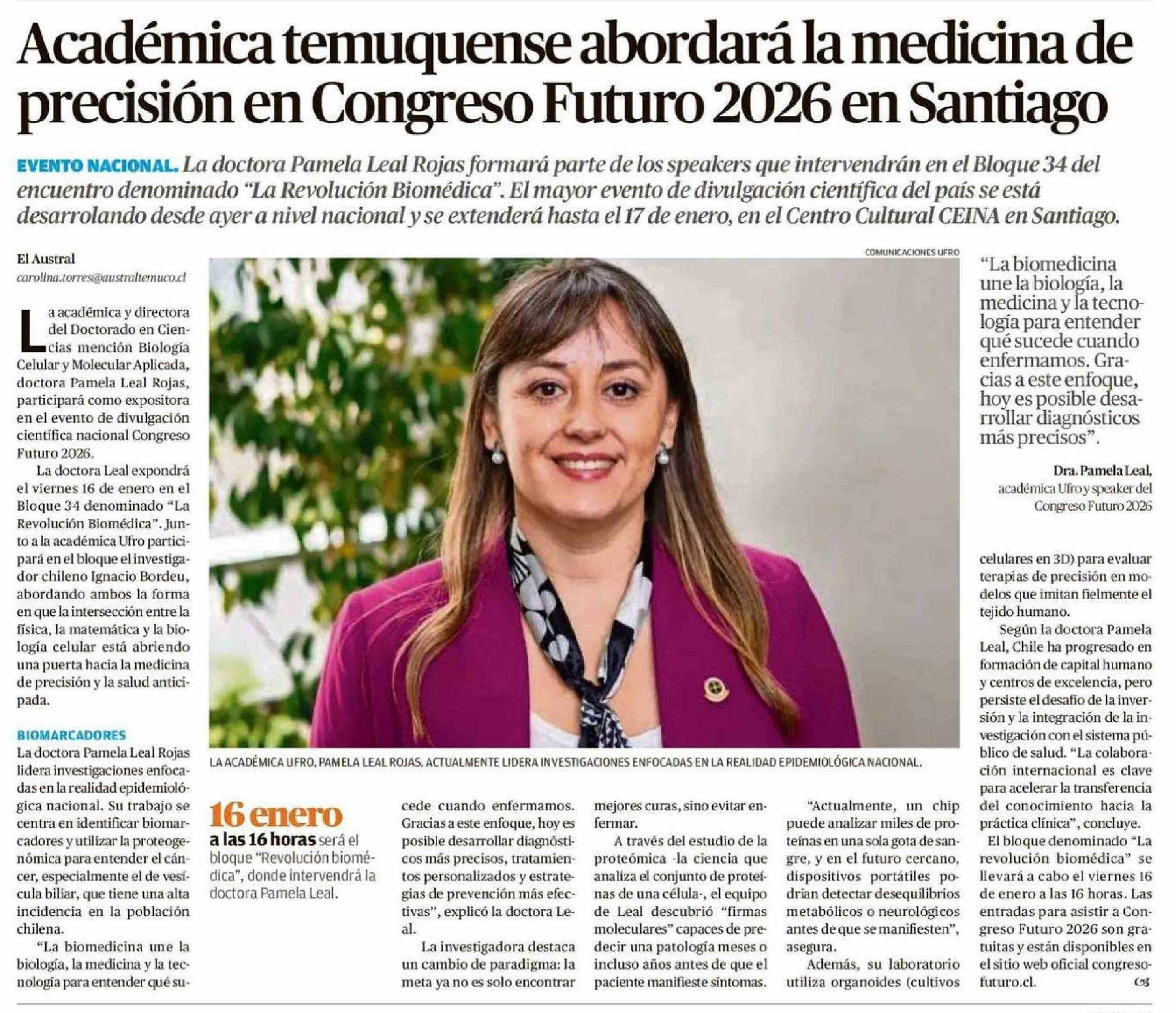 Académica temuquense abordará la medicina de precisión en Congreso Futuro 2026 en Santiago