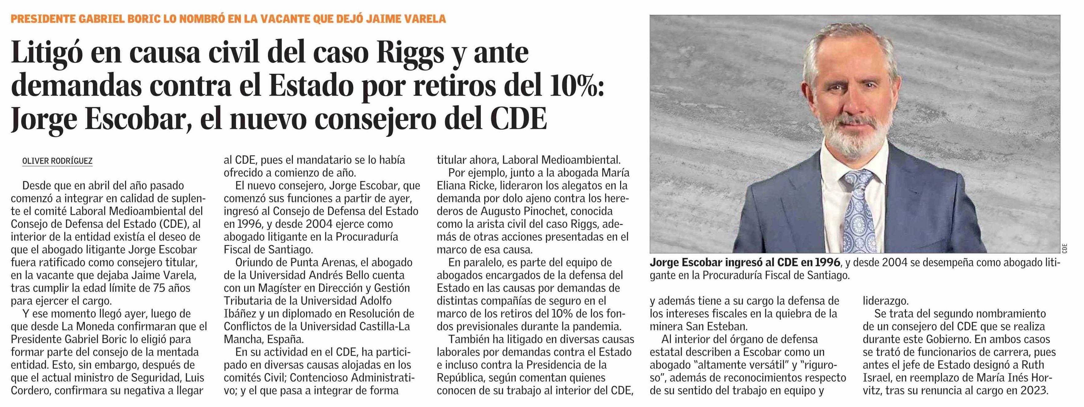 Litigó en causa civil del caso Riggs y ante demandas contra el Estado por retiros del 10%: Jorge Escobar, el nuevo consejero del CDE