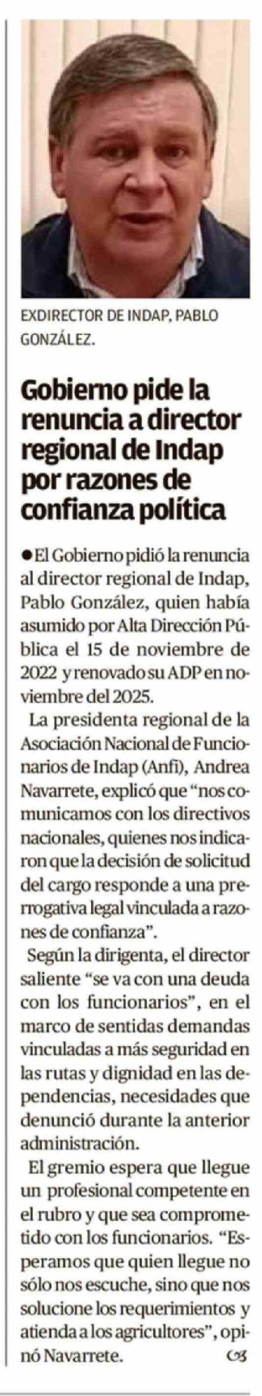 Gobierno pide la renuncia a director regional de Indap por razones de confianza política