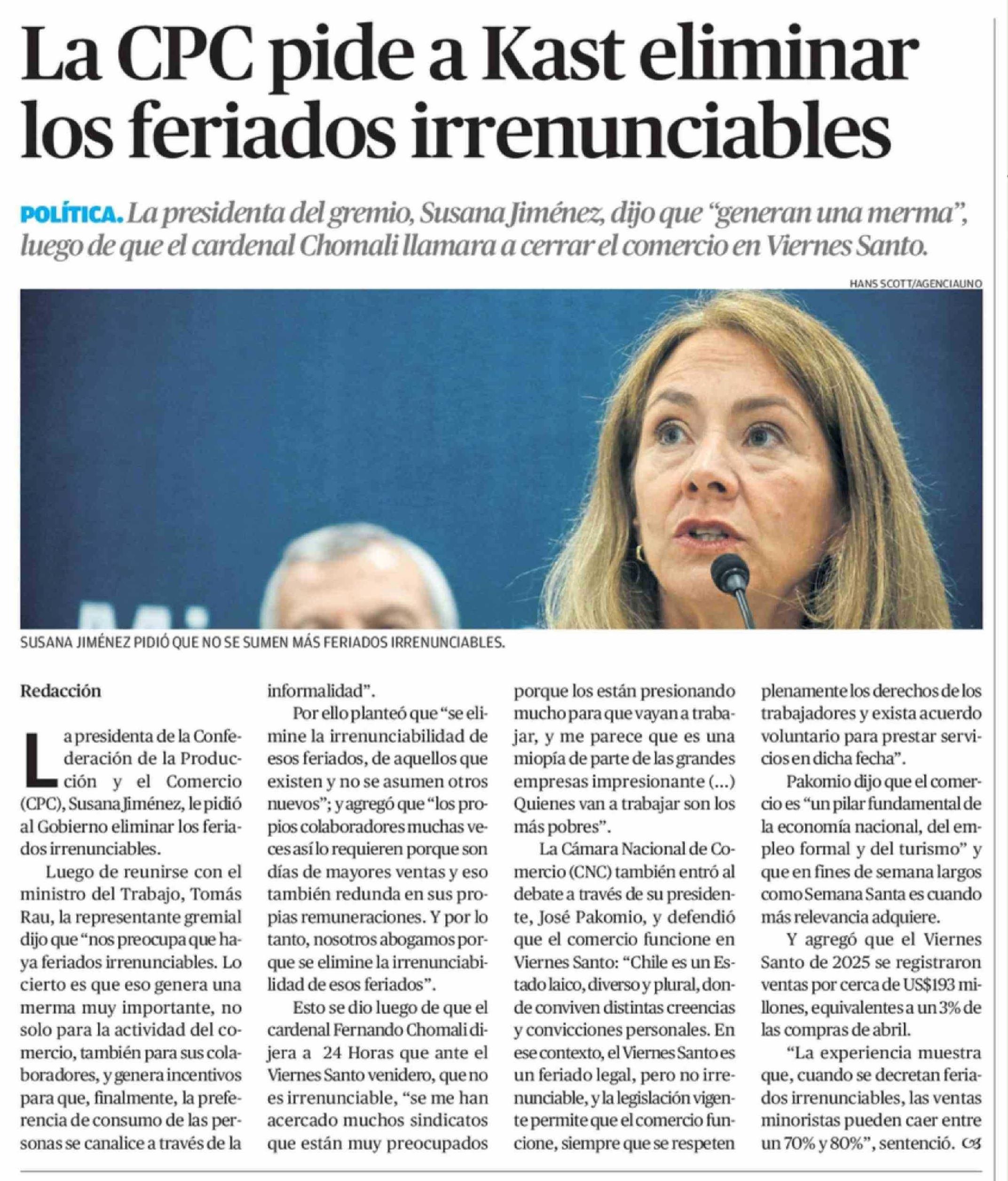 La CPC pide a Kast eliminar los feriados irrenunciables