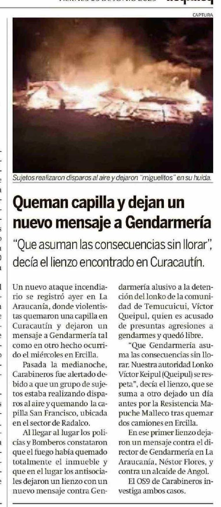 Queman capilla y dejan un nuevo mensaje a Gendarmería