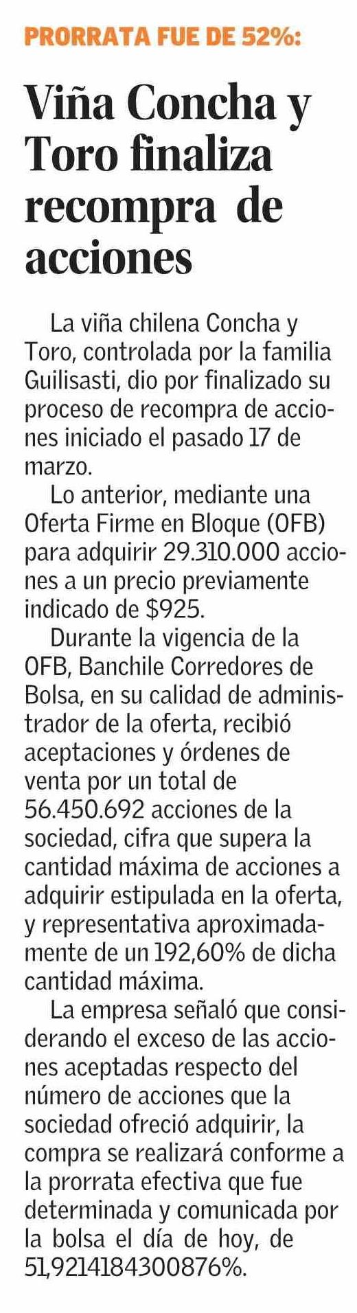 Viña Concha y Toro finaliza recompra de acciones