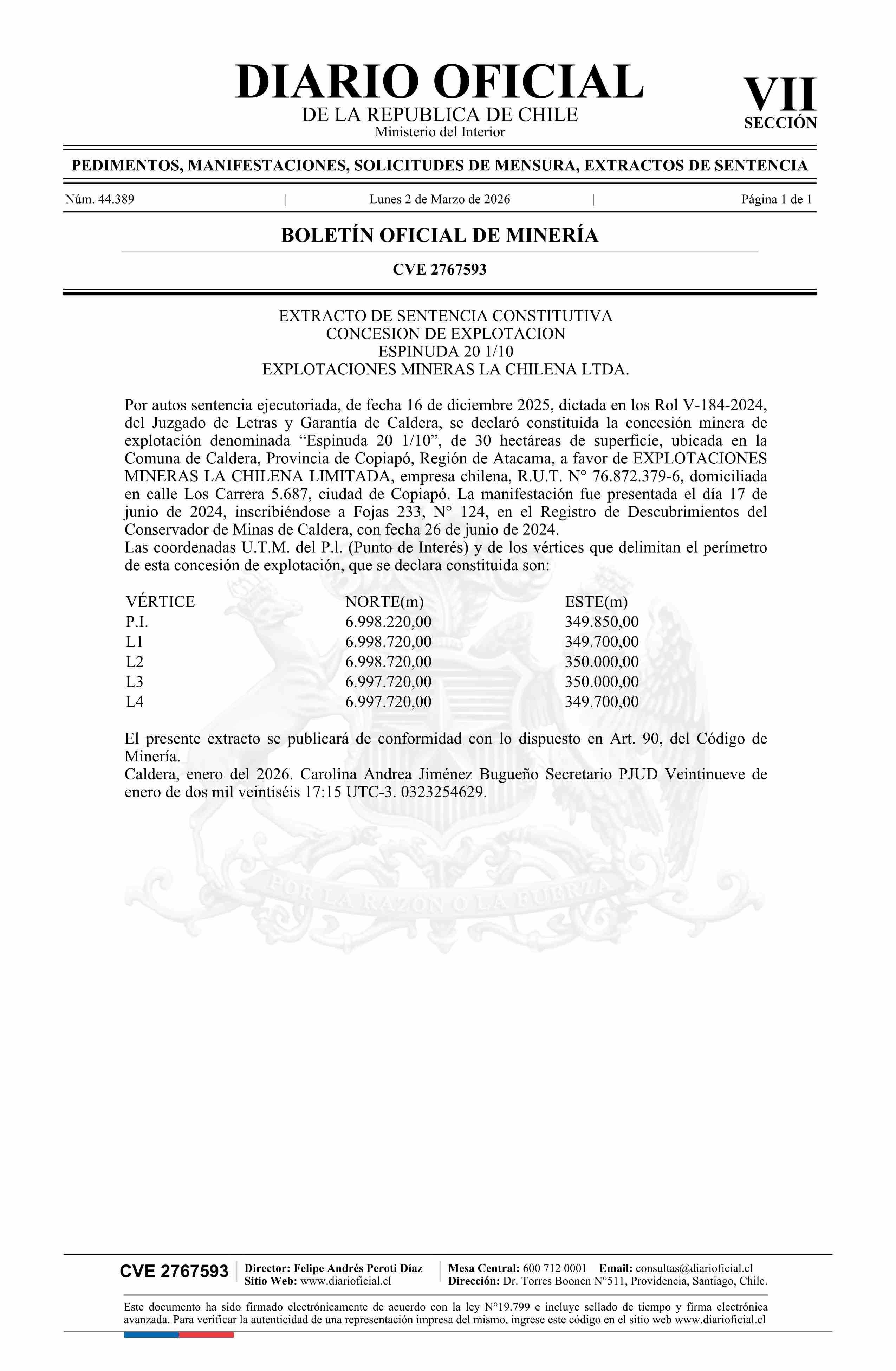 ESPINUDA 20 1/10 / Explotaciones Mineras La Chilena Limitada