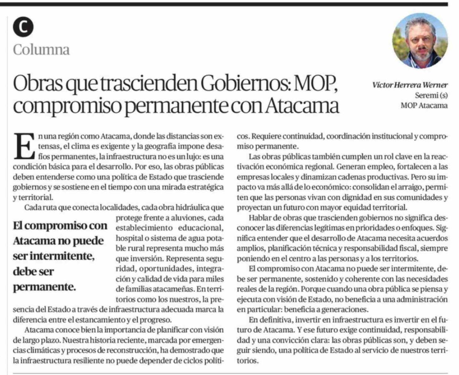 Columnas de Opinión: Obras que trascienden Gobiernos: MOP, compromiso permanente con Atacama